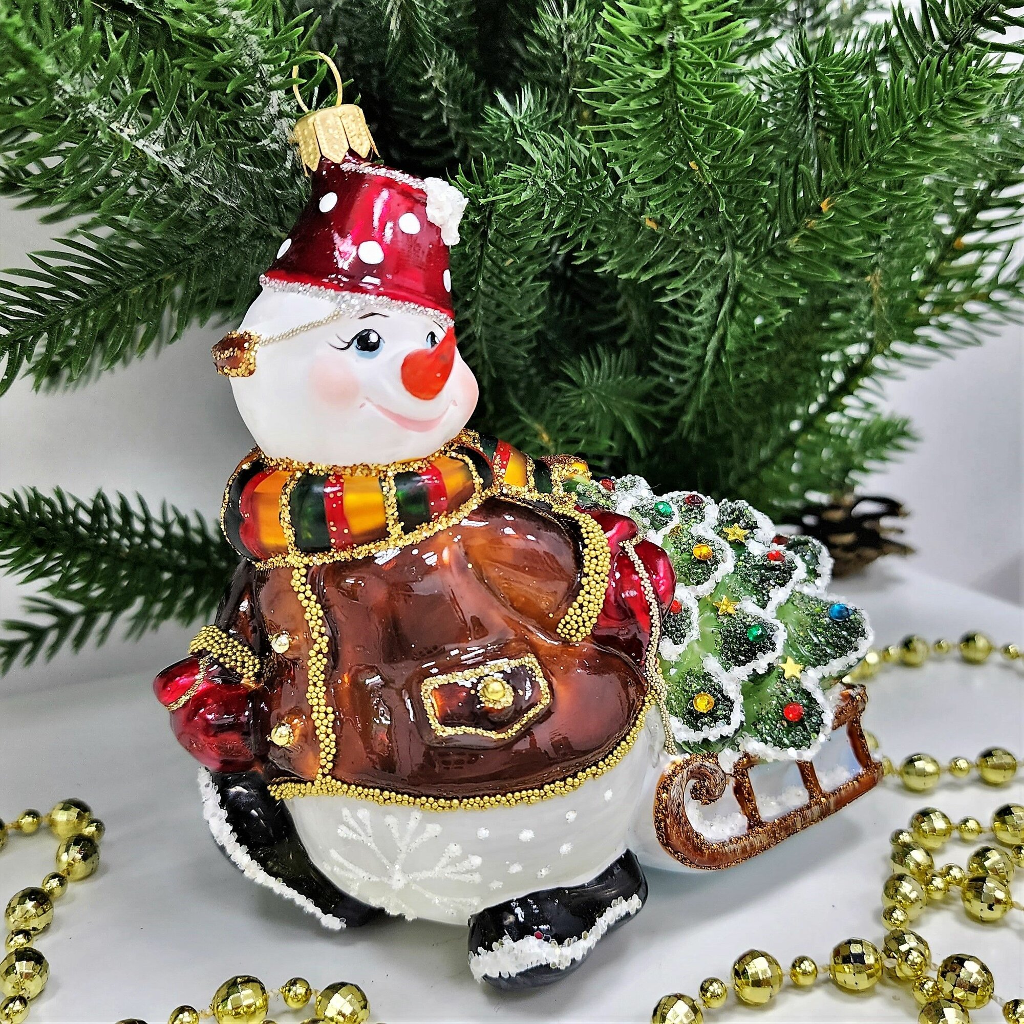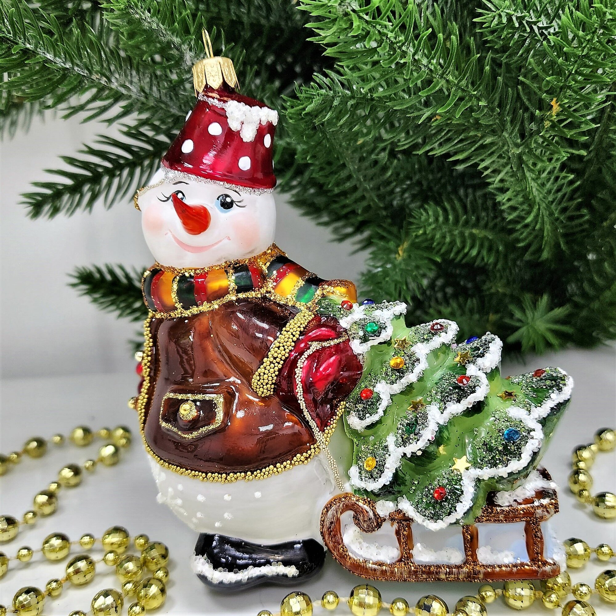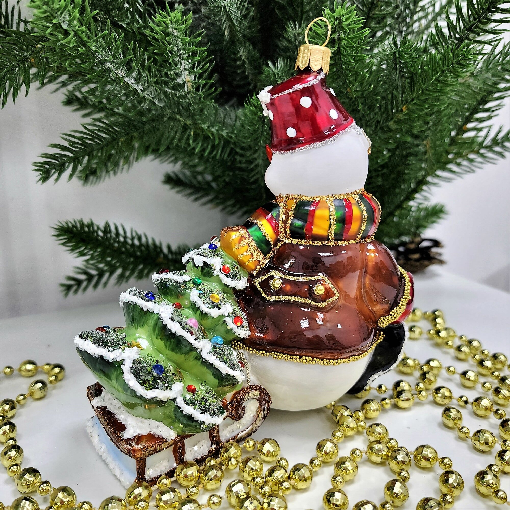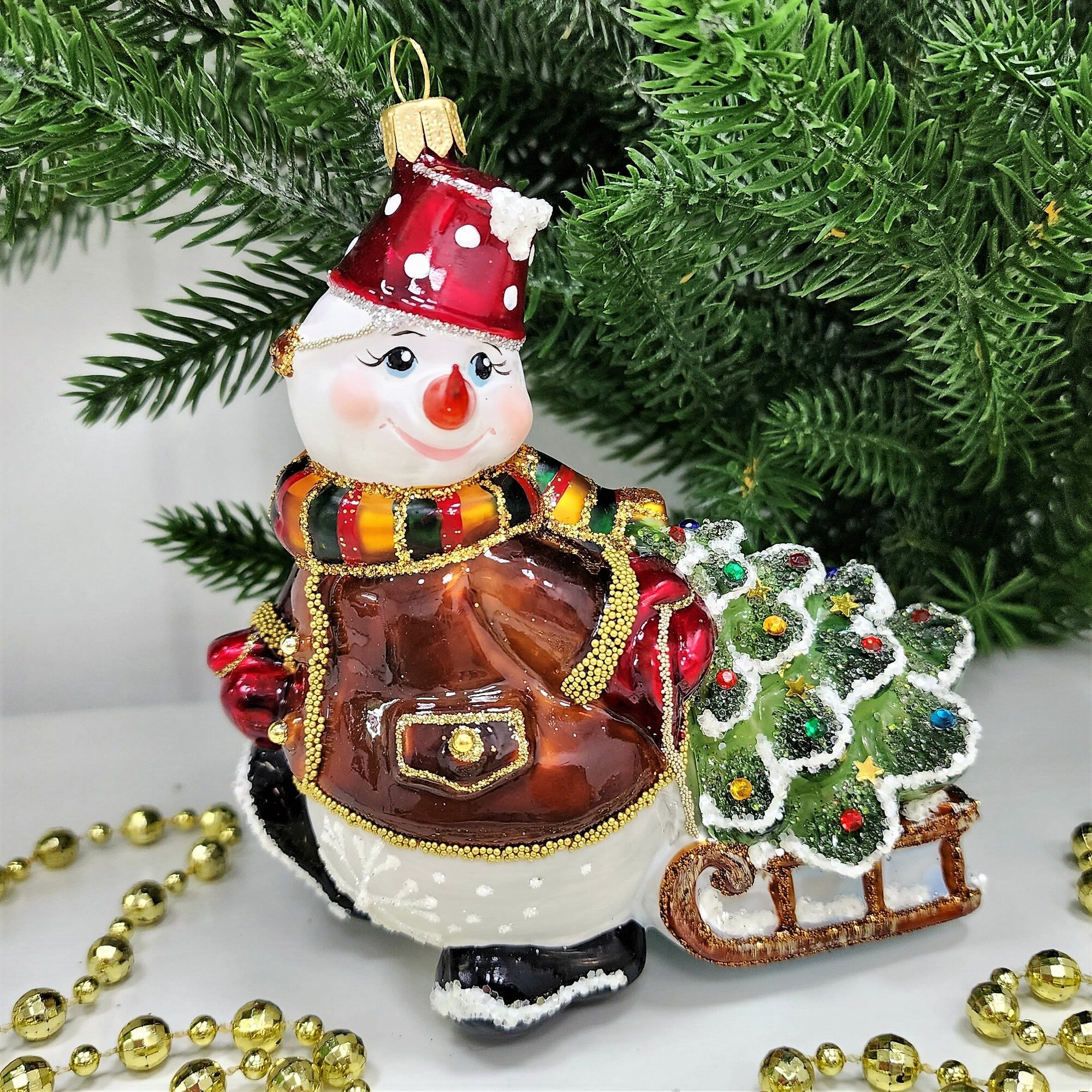 Купить Irena-Co елочная игрушка, стекло Снеговик тянет саночки (12х11,5х6см)