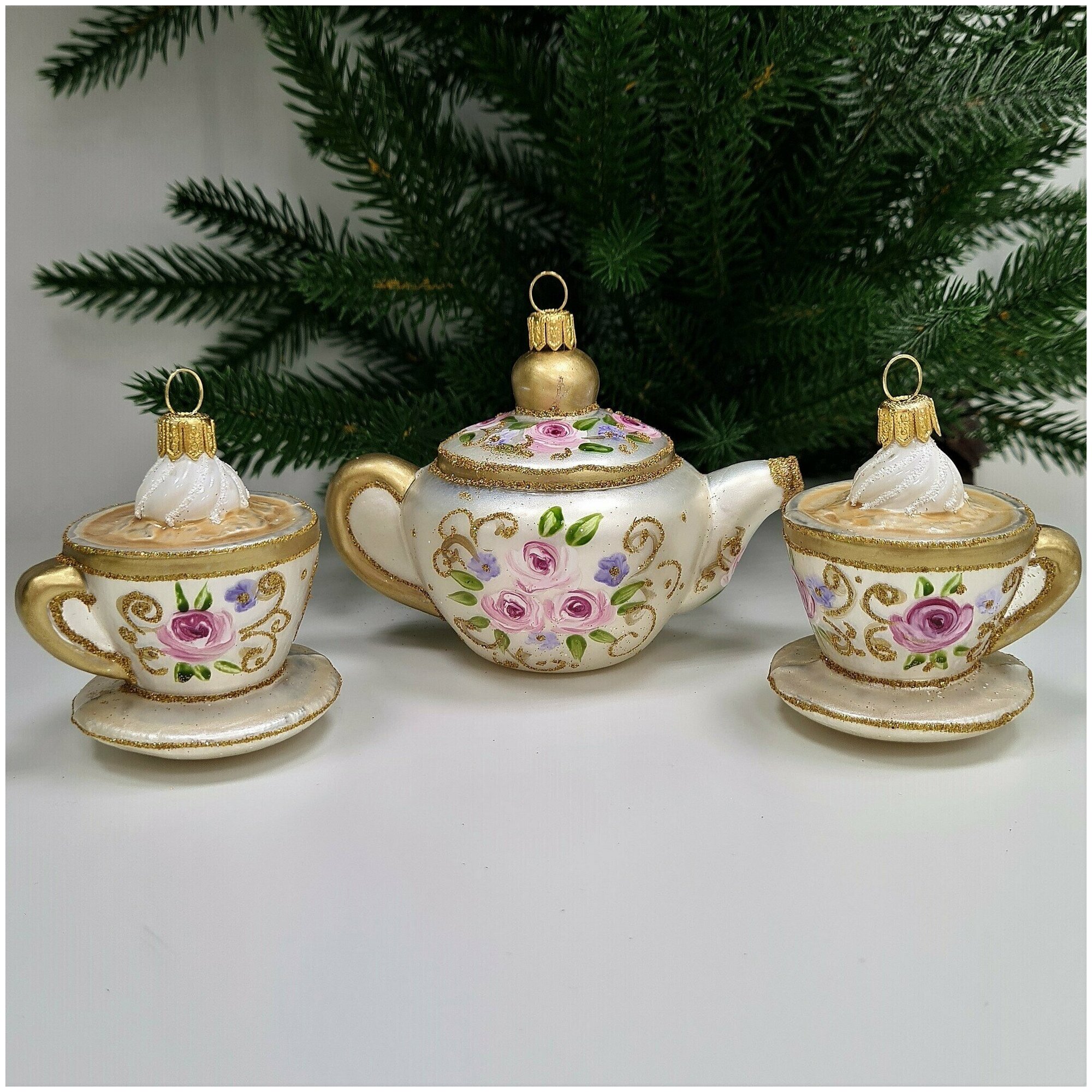 Irena-Co Набор елочных игрушек, стекло Чайник - 10х11х8, Чашки - 9,5х6,5х7,5 - 2шт