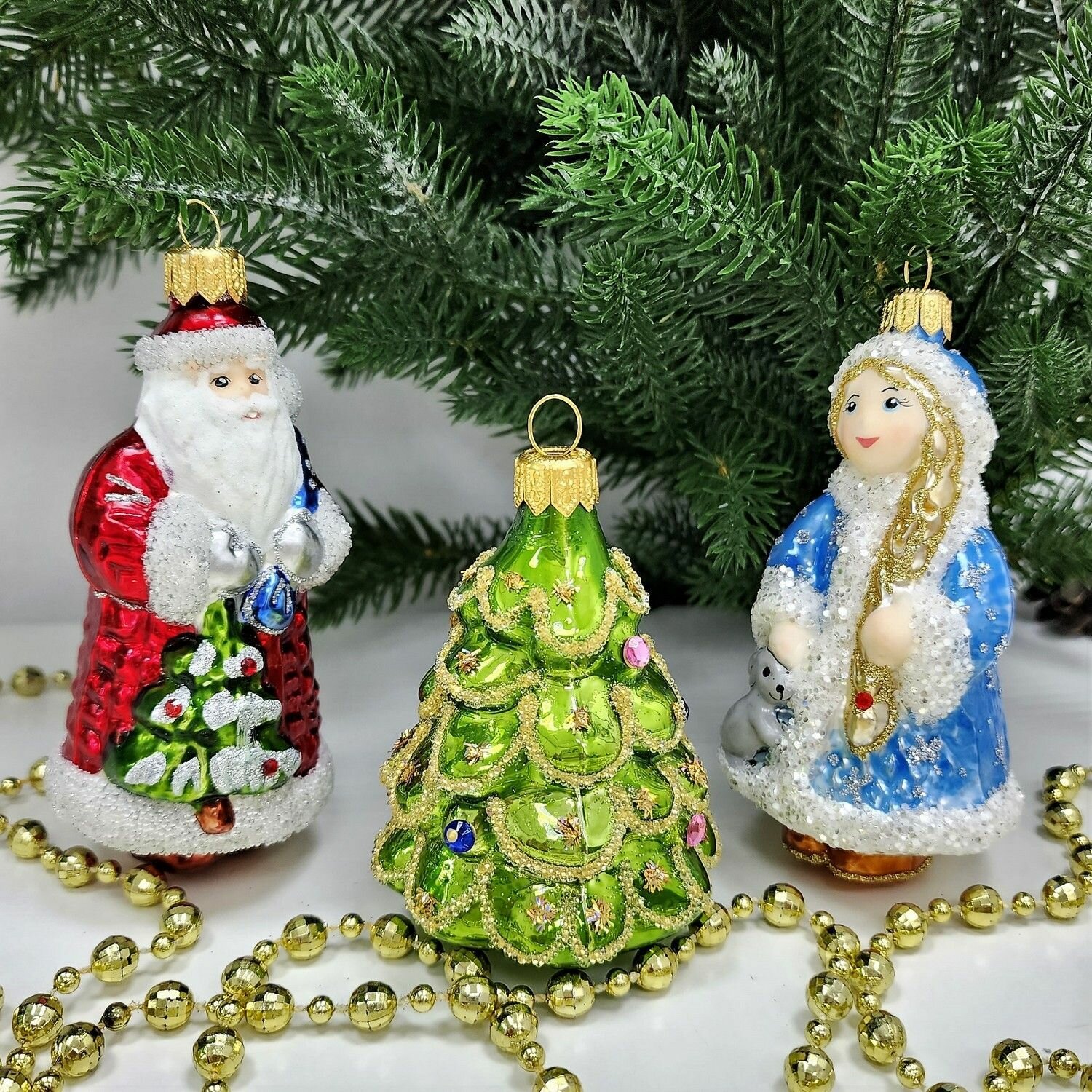 Купить Irena-Co Набор елочных игрушек, стекло Дед Мороз - 10х5х5,5см, Снегурочка - 9,5х5,5х5см, Ёлка - 7,5х6х6см