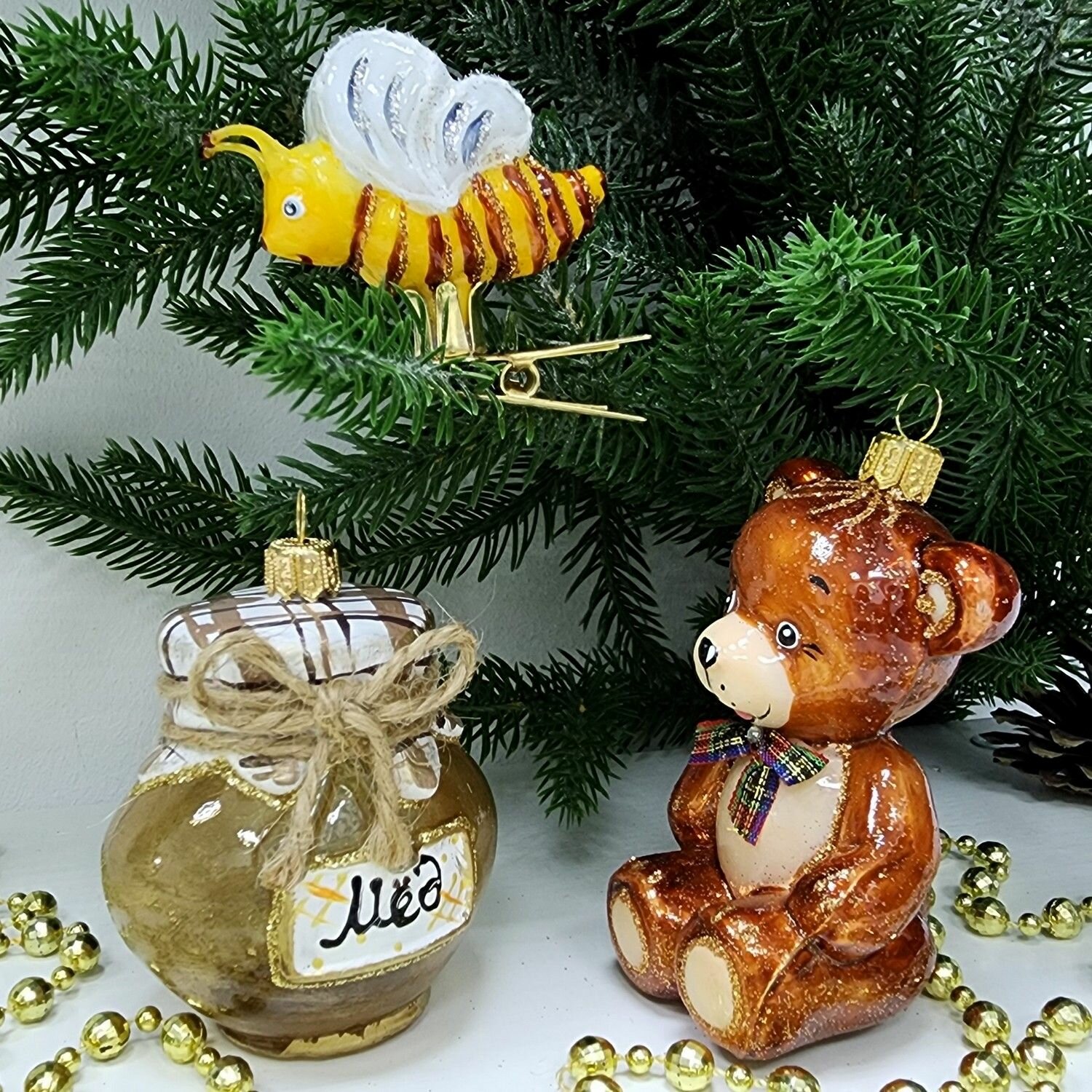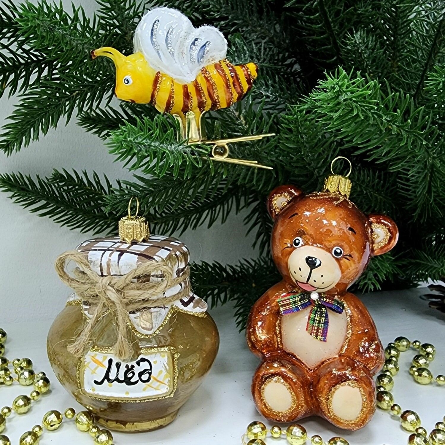 Купить Irena-Co Набор елочных игрушек, стекло Мишка - 10х5,5х5,5см, Пчёлка - 4х6х2,5см, Баночка - 7х7х5см