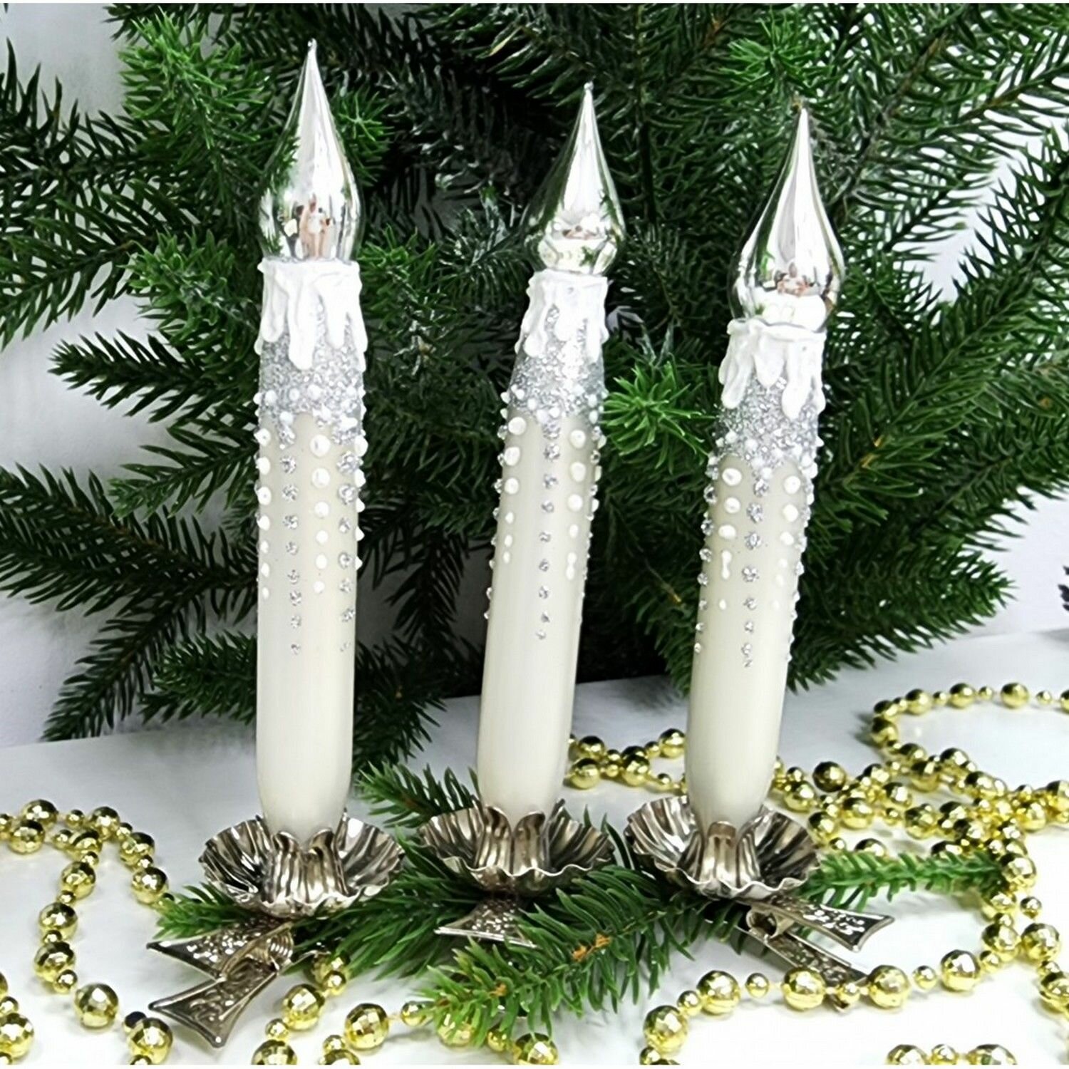 Купить Irena-Co Набор елочных игрушек, стекло Свечи тонкие серебро (Свеча - 12х2х2см - 3шт)