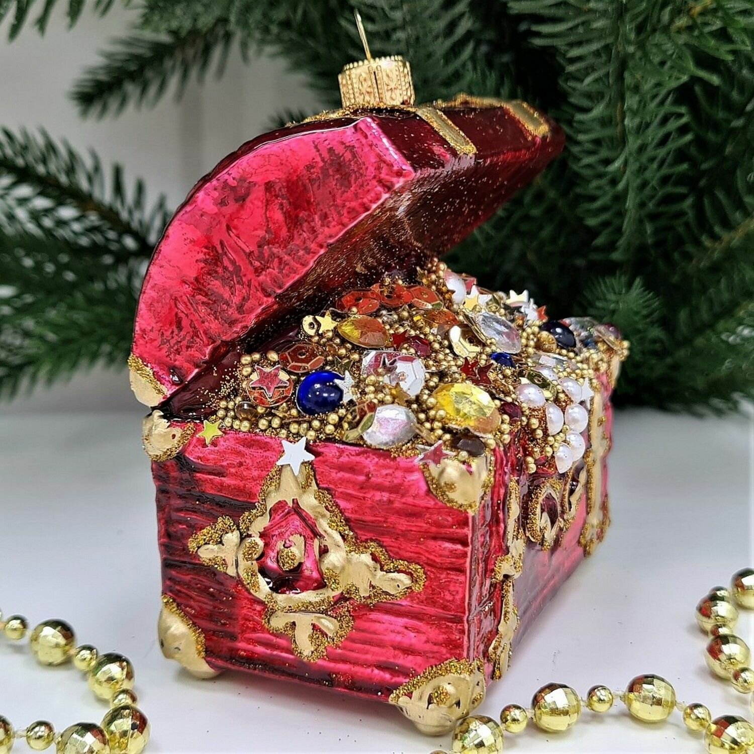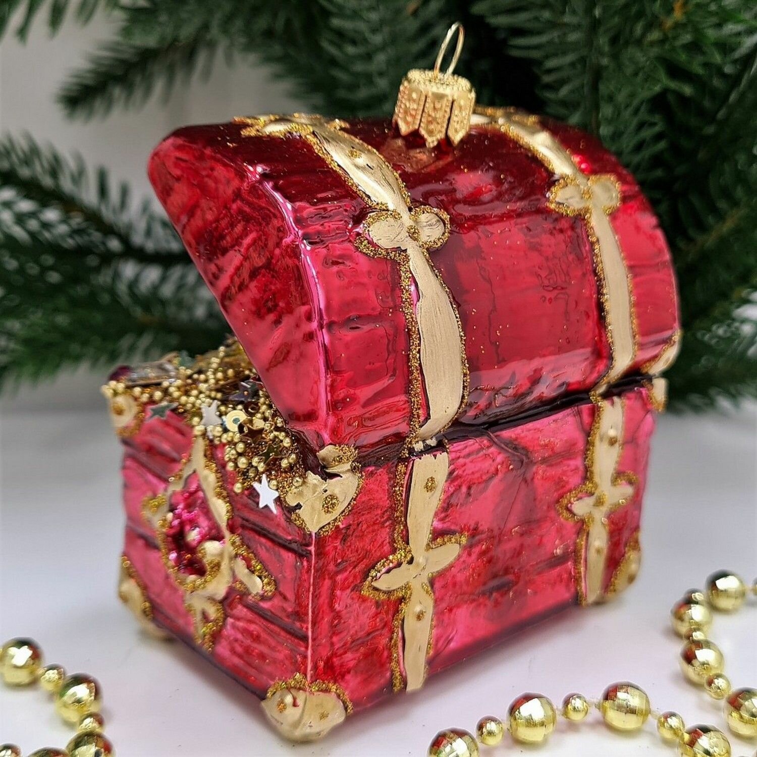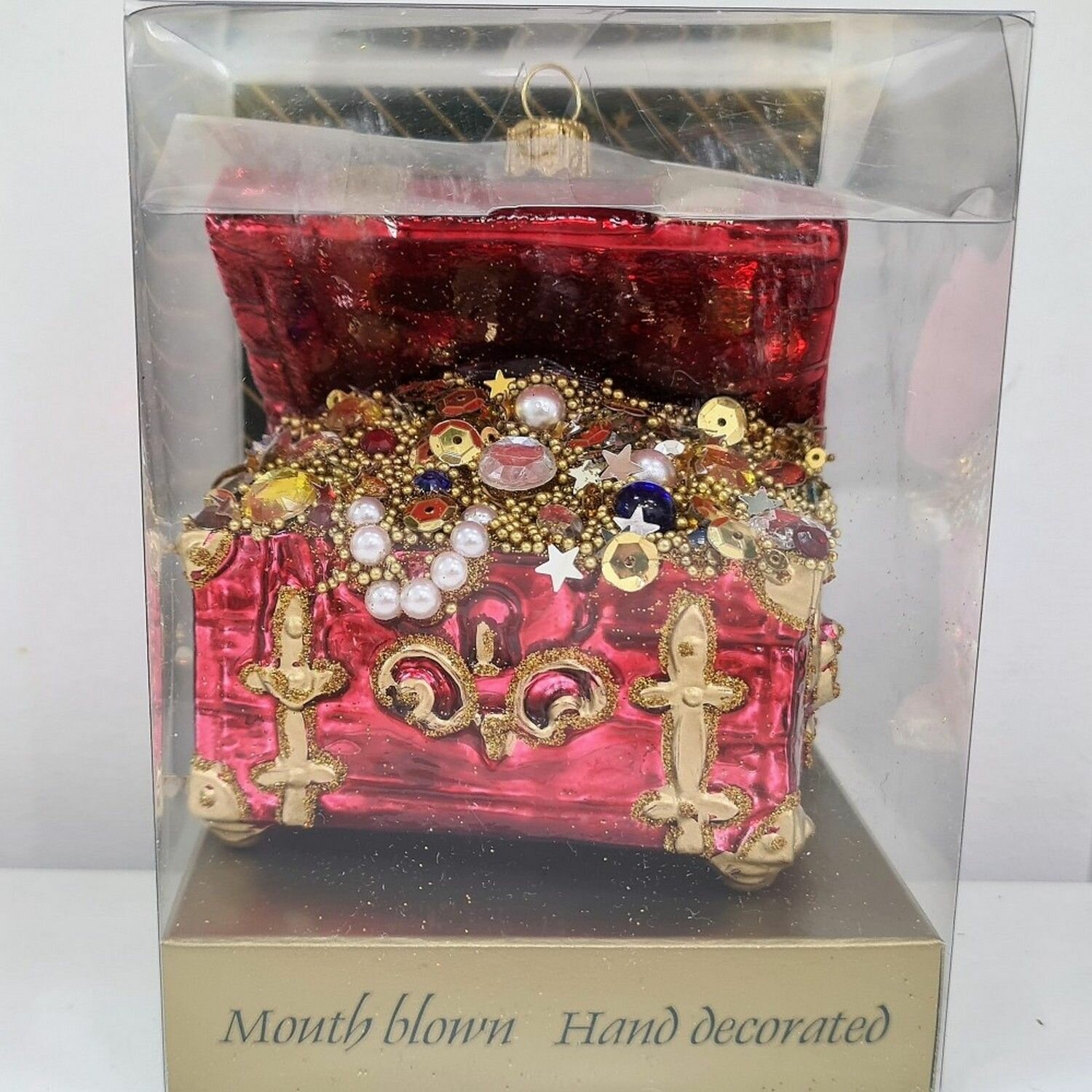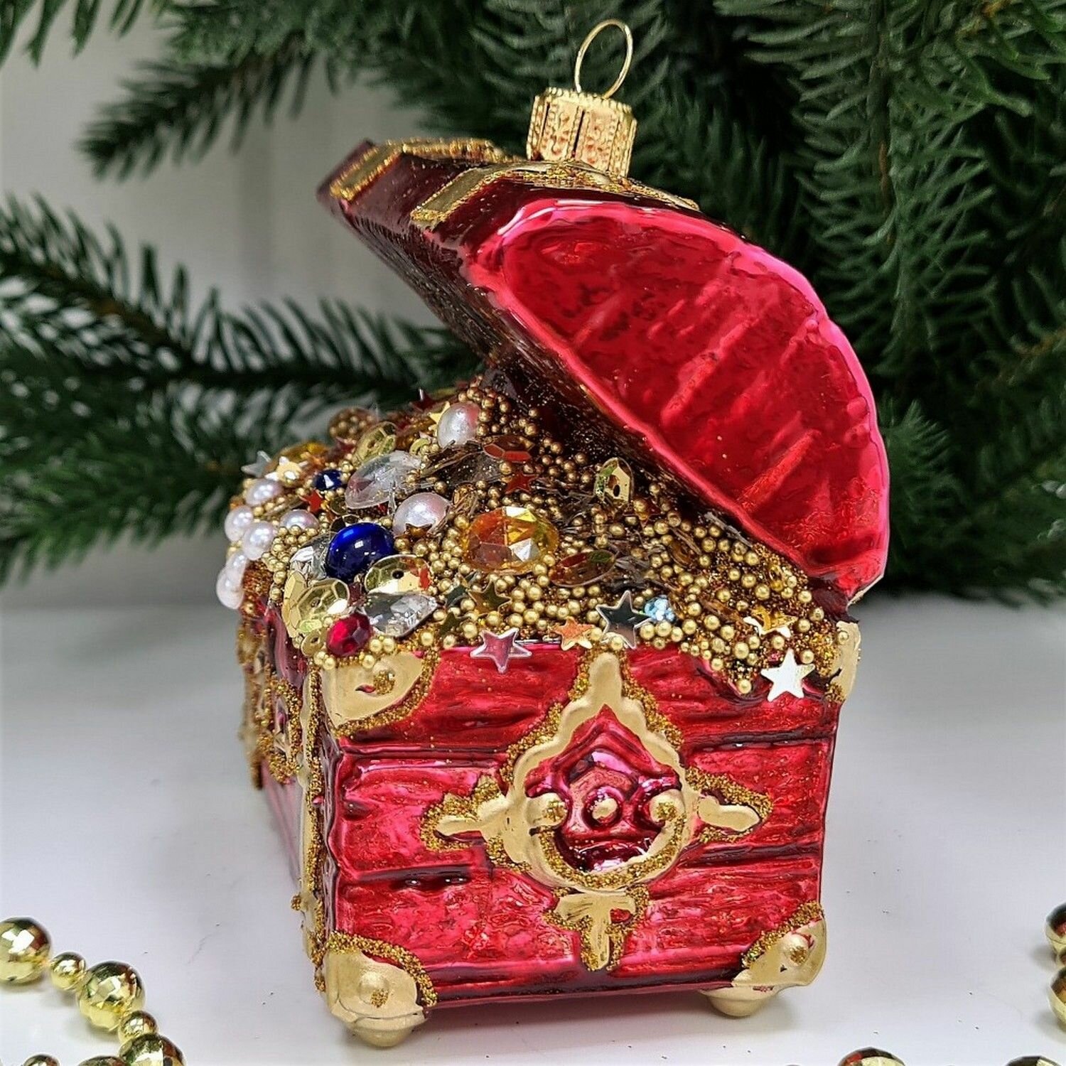 Купить Irena-Co елочная игрушка, стекло Сундук с золотом красный (10х8,5х5,5см)