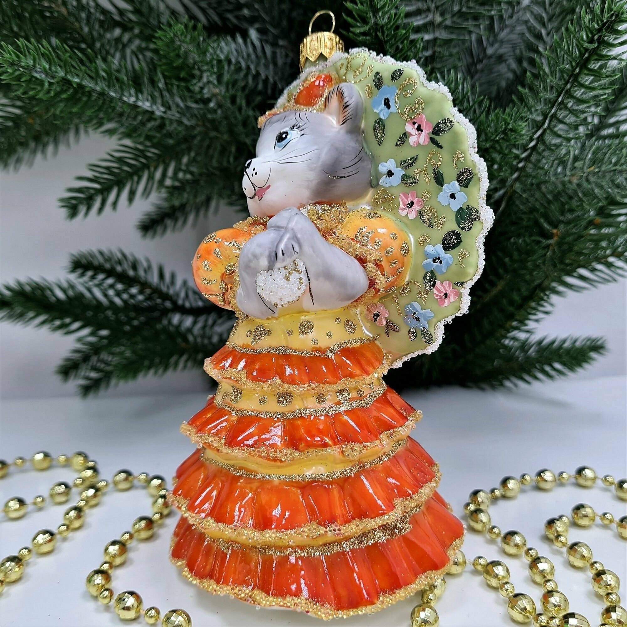 Купить Irena-Co елочная игрушка, стекло Кошка с зонтиком оранжевая (Символ года 2023) (14х9х10см)