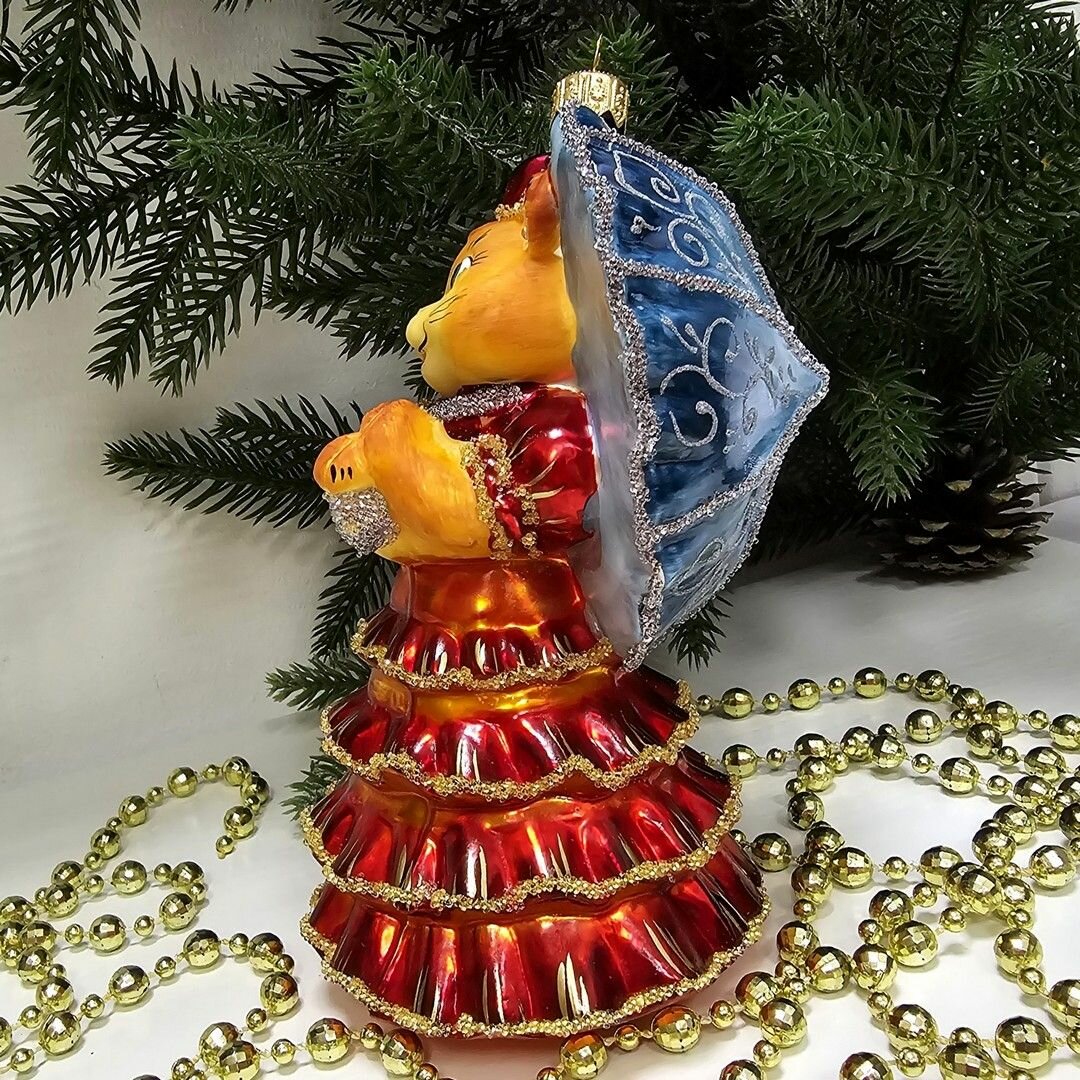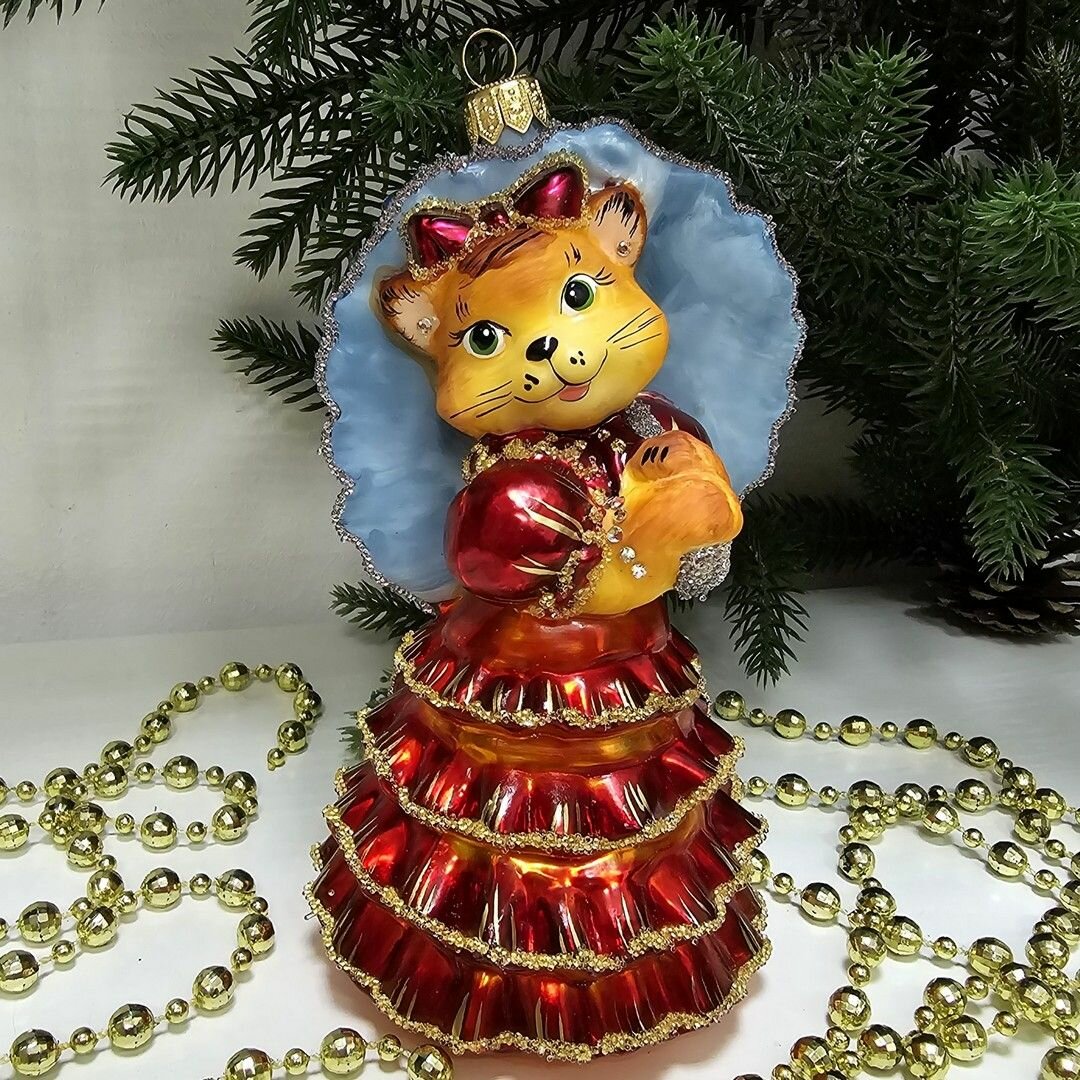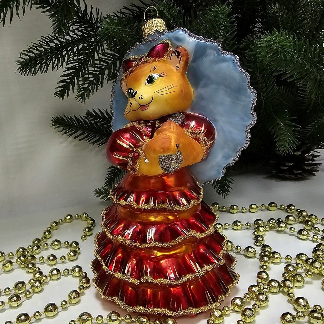 Irena-Co елочная игрушка, стекло Кошка с зонтиком красная (Символ года 2023) (14х9х10см)