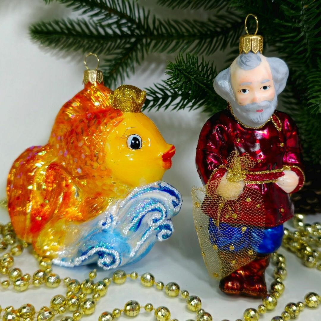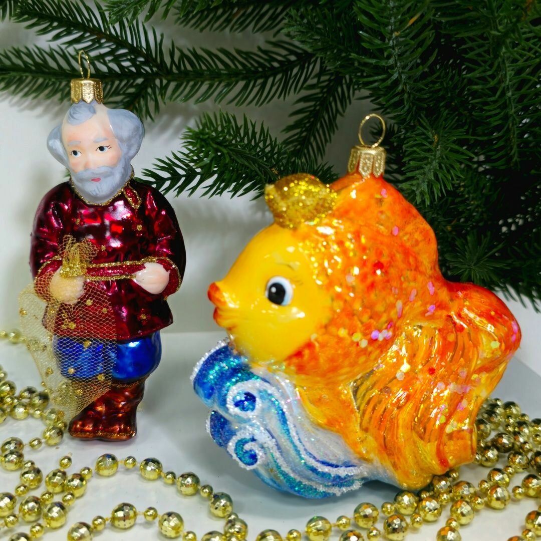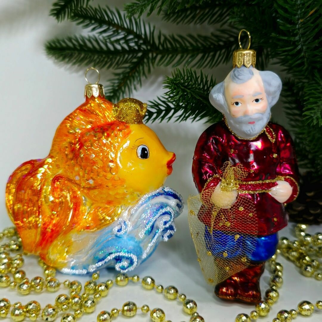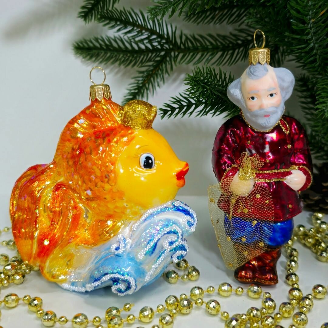Irena-Co Набор елочных игрушек, стекло Дед - 12х5,5х4,5, Золотая рыбка - 10х10,5х5,5