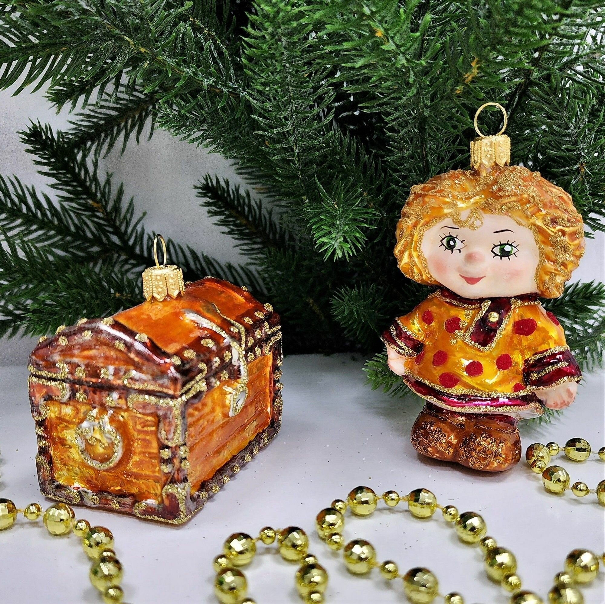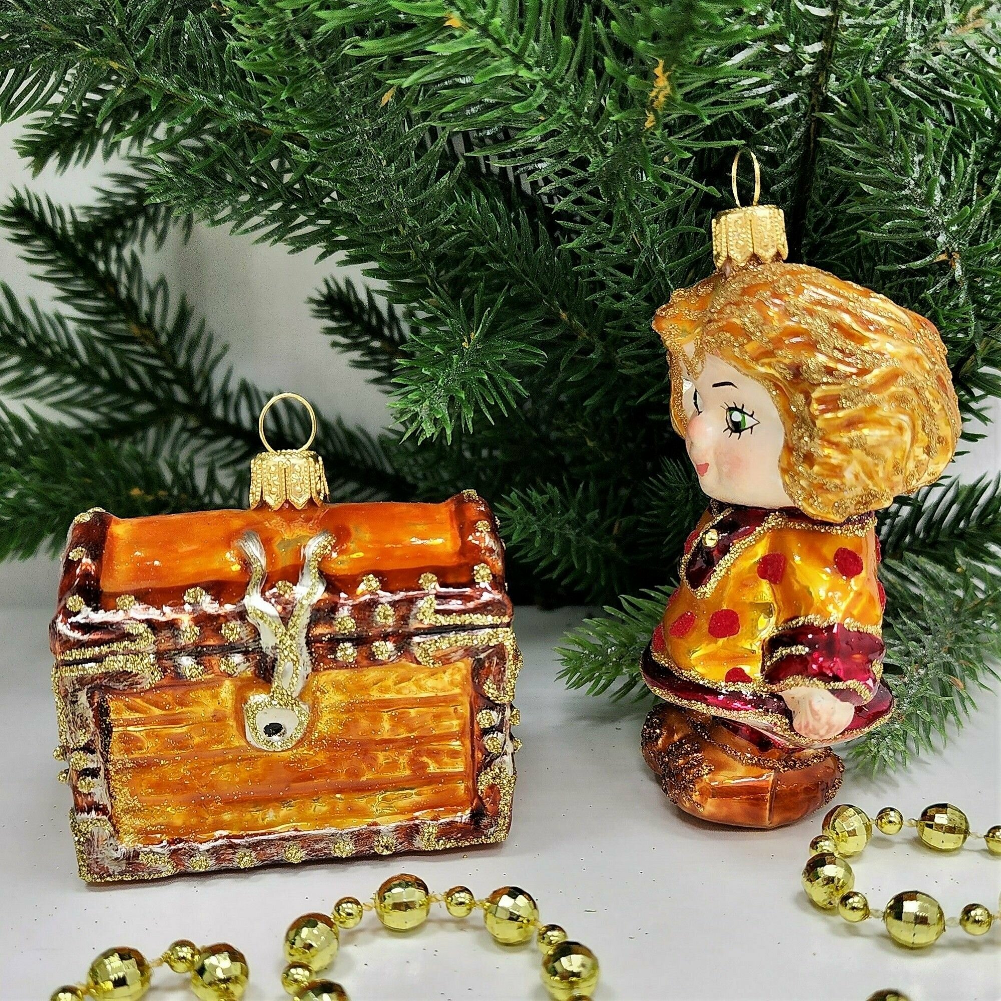 Купить Irena-Co Набор елочных игрушек, стекло Кузя - 8,5х6х4, Сундук - 6х6,5х4,5