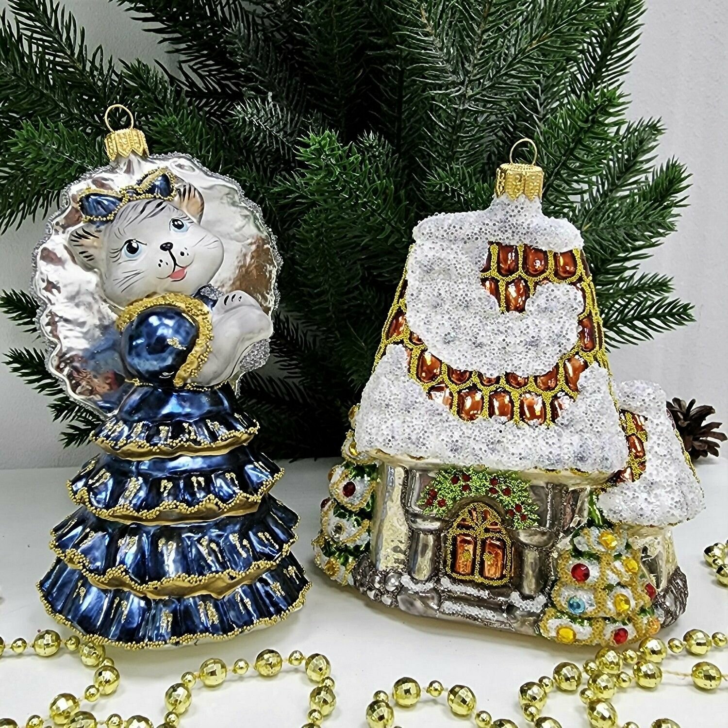 Купить Irena-Co Набор елочных игрушек, стекло Дом - 13х12,5х8,5, Кошка - 15х9х8,5