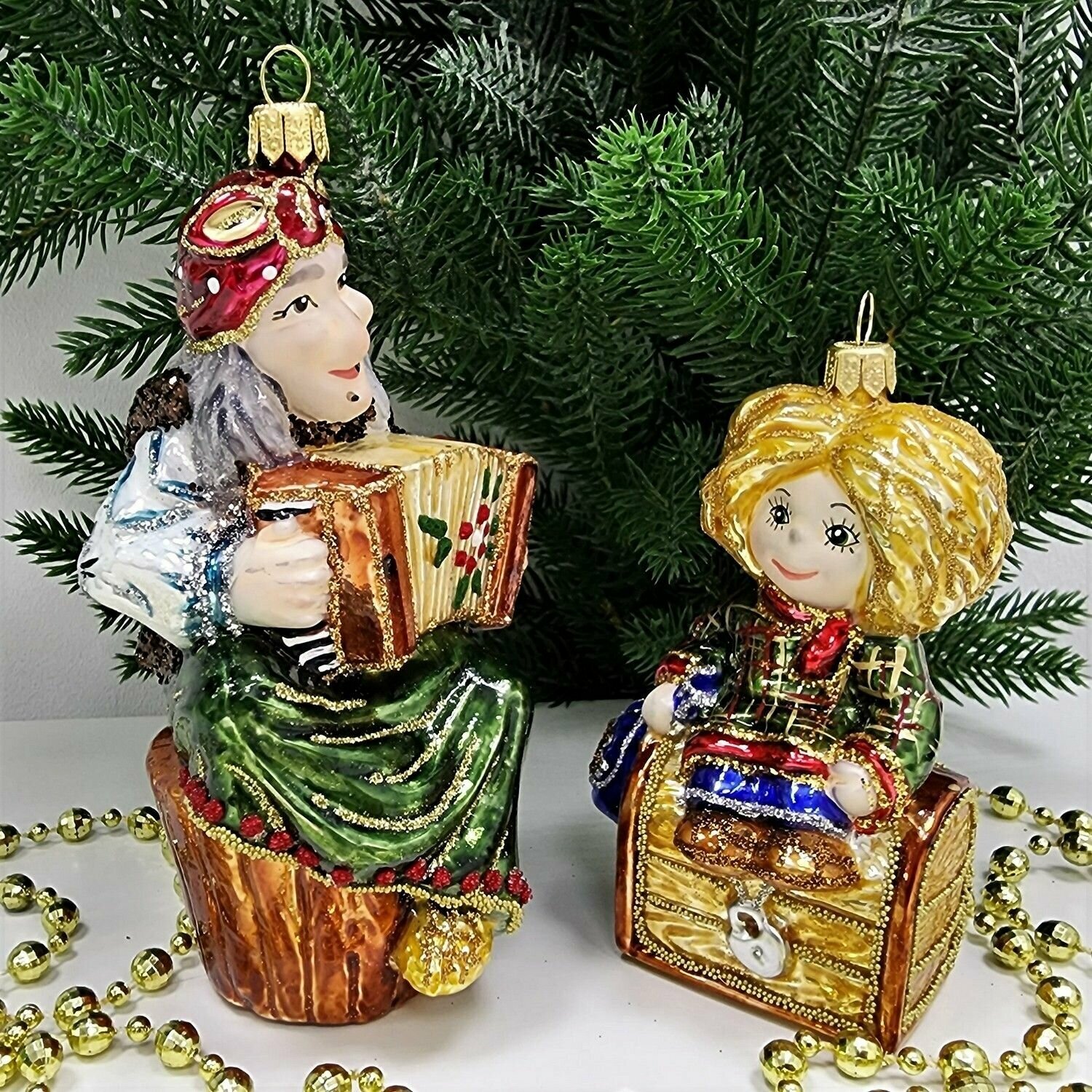 Irena-Co Набор елочных игрушек, стекло Бабушка с кувшином и дед с балалайкой (Бабушка - 13,5х8х7см, Дедушка - 12х8х5,5см)