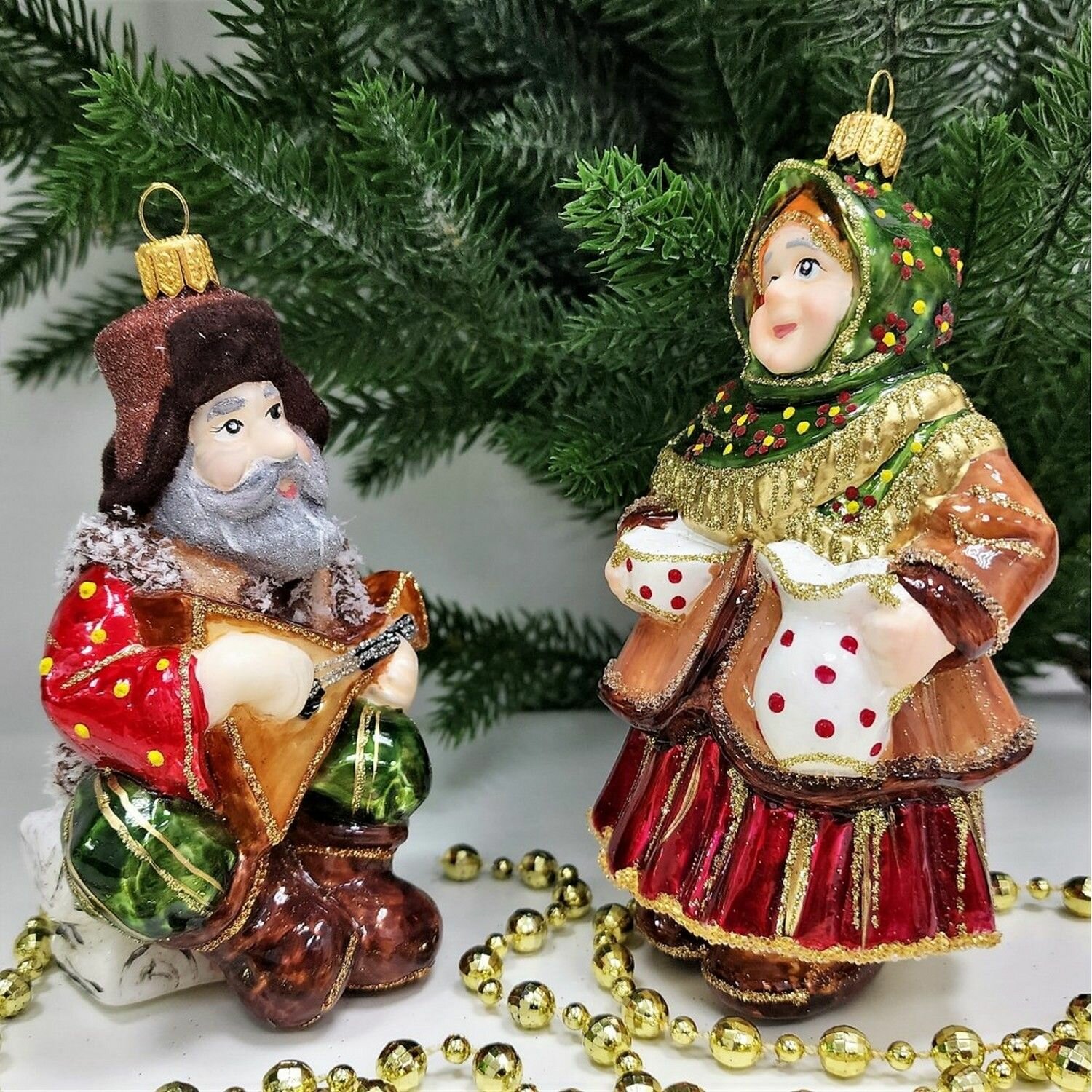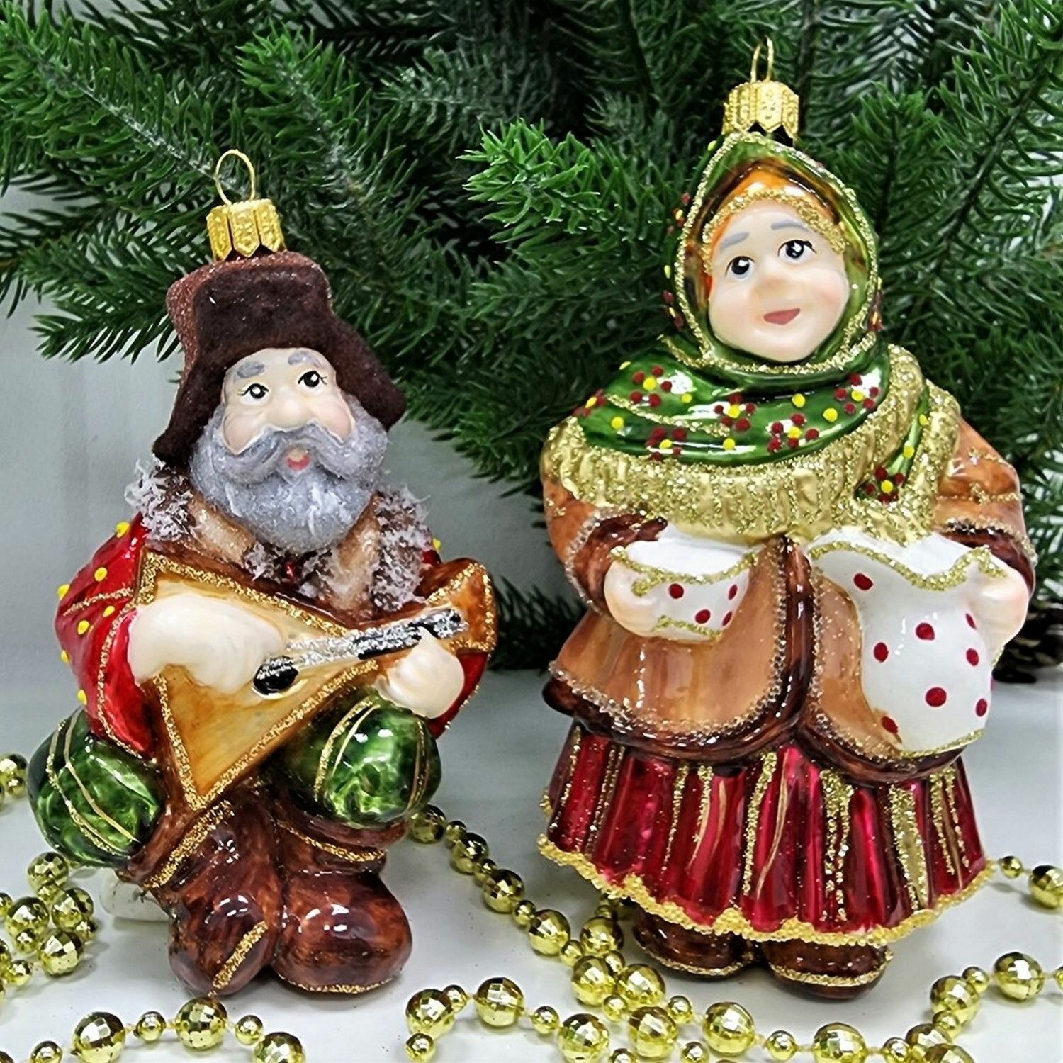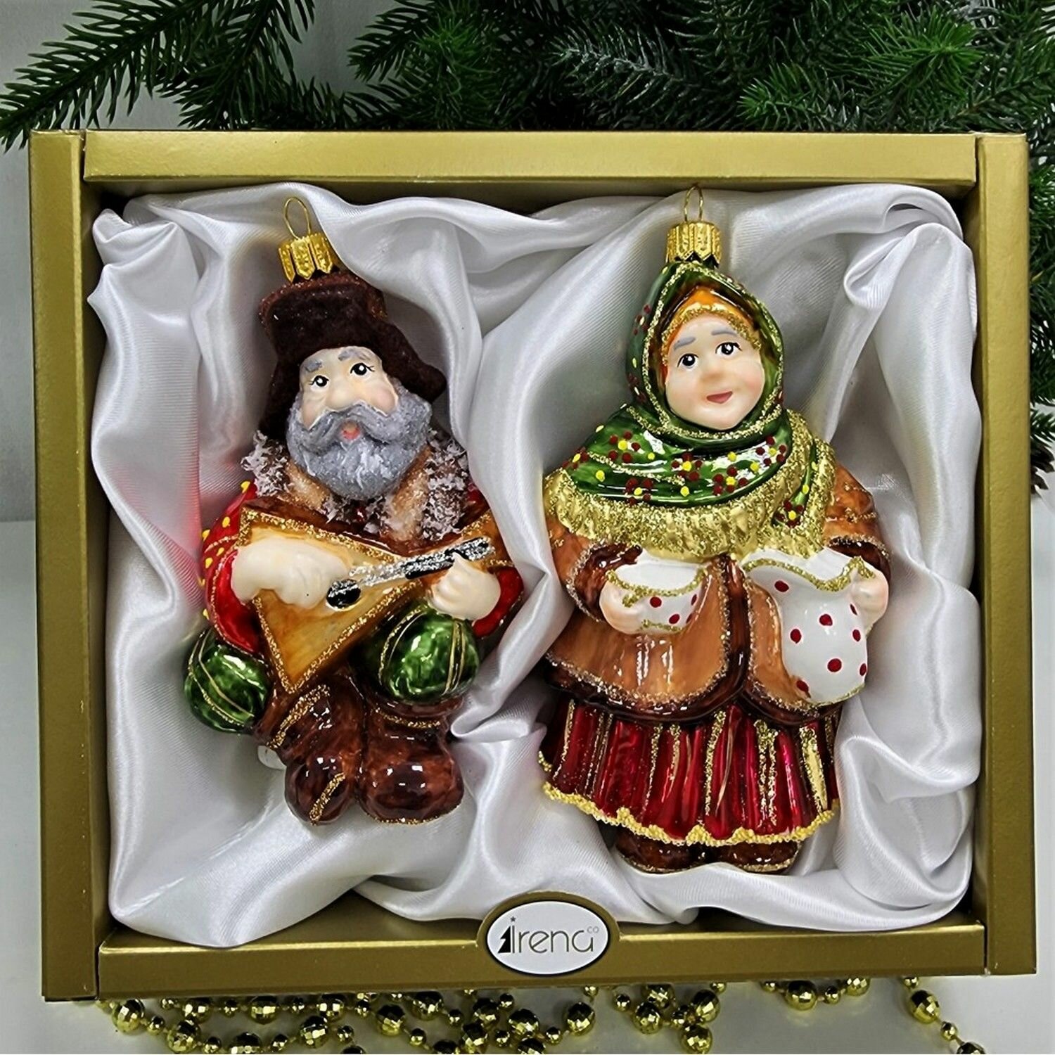 Купить Irena-Co Набор елочных игрушек, стекло Бабушка с кувшином и дед с балалайкой (Бабушка - 13,5х8х7см, Дедушка - 12х8х5,5см)