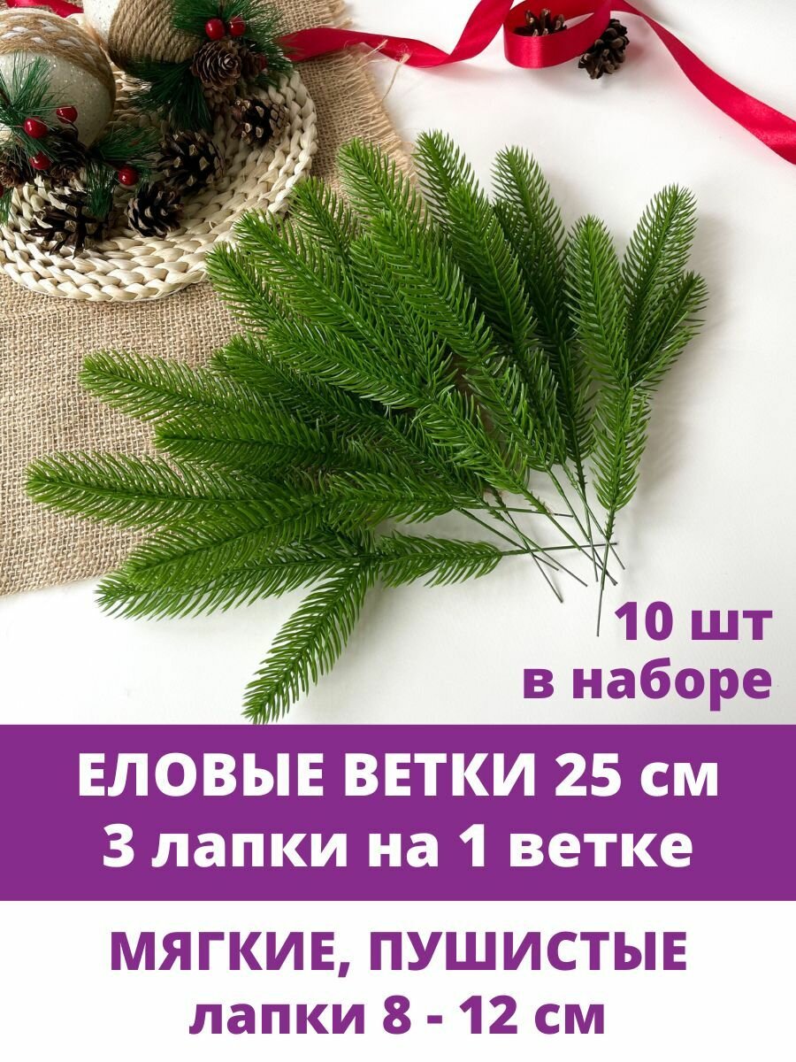Купить Еловая ветка, декор зимний, рождественский, 3 лапки, 25 см, набор 10 веток