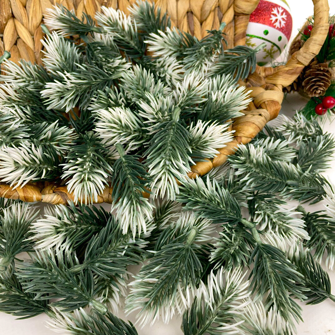 Купить Еловые лапки искусственные, мини, ветки для декора, творчества, поделок, Бело-зеленые 6 см, 50 штук