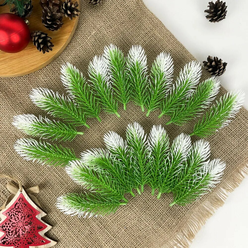 Еловые лапки искусственные, мини, ветки для декора, творчества, поделок, Бело-зеленые 6 см, 50 штук