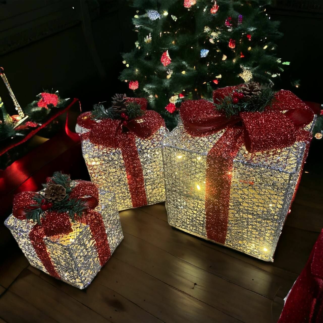 Новогодняя декорация подарочные коробки с подсветкой 25*25/20*20*/15*15 см 3 шт. Серебряная интересное: