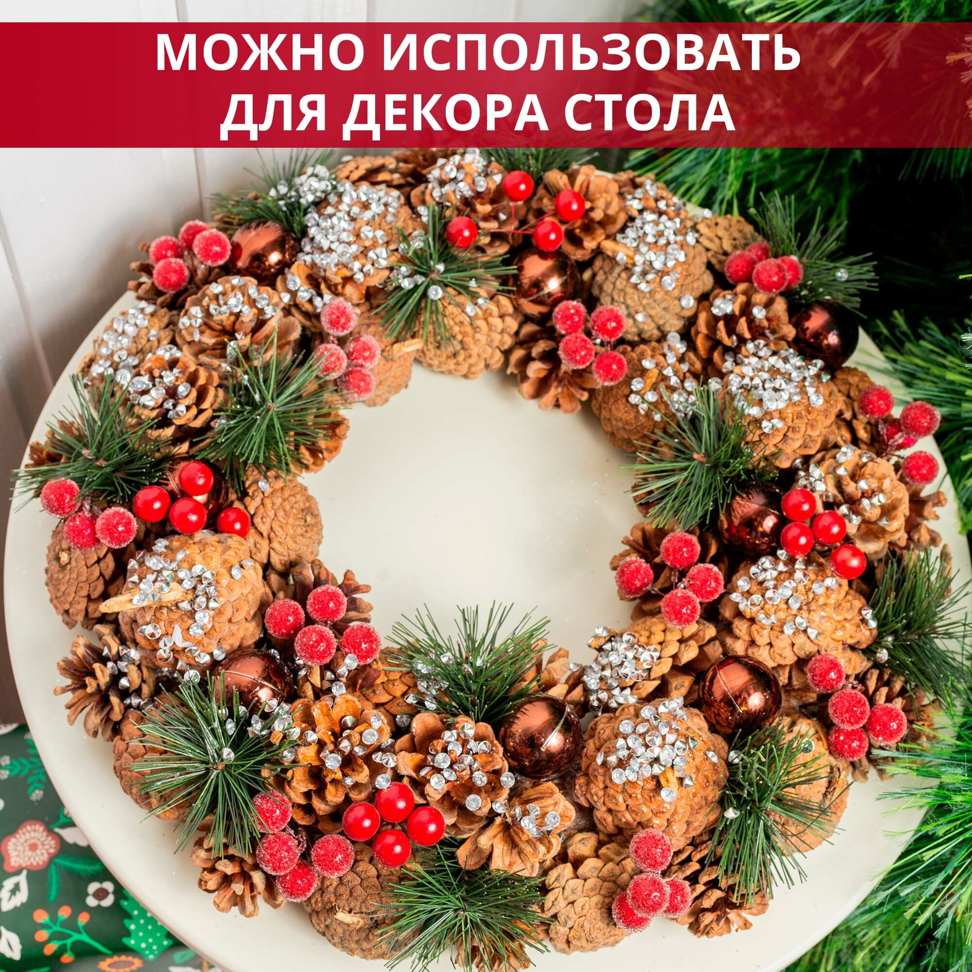 Рождественский венок новогодний на дверь и декор на стол с шишками и шариками, с еловыми веточками интересное: