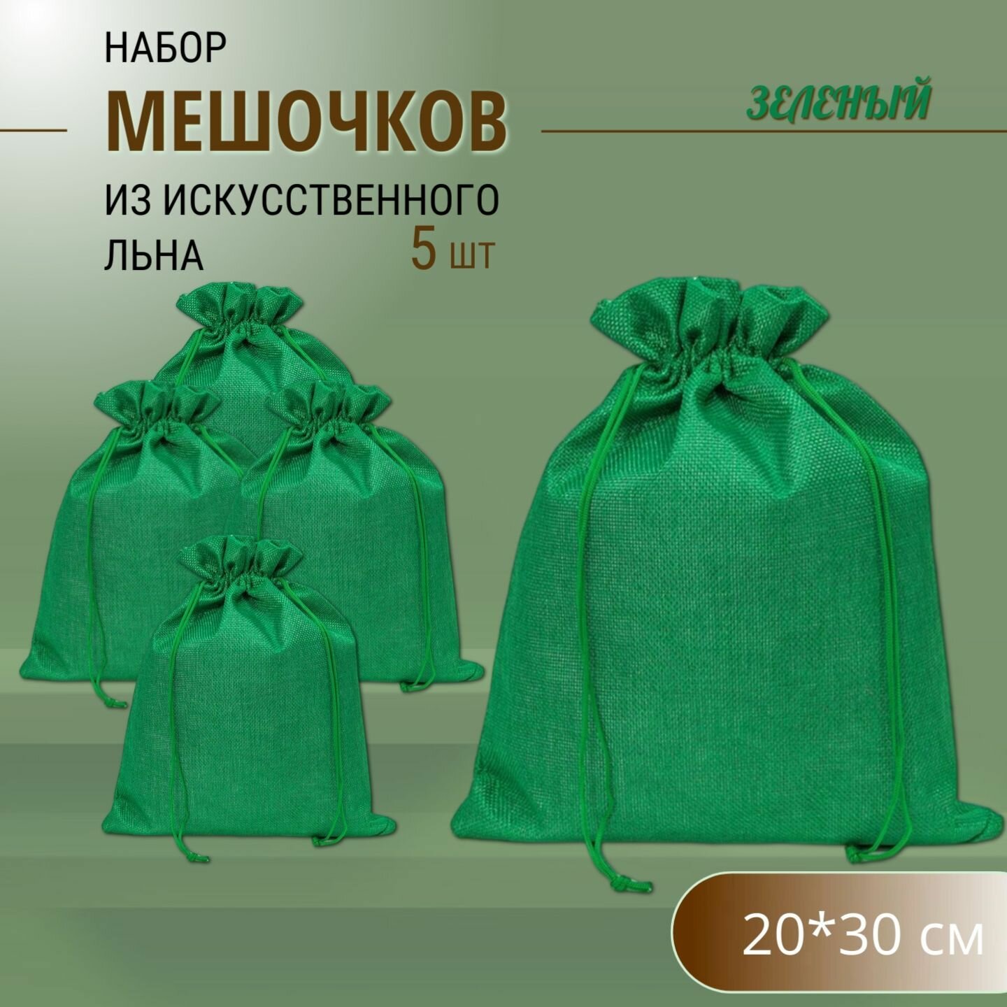 Купить Подарочные мешочки льняные (иск.) 20х30 см (5 шт.) / мешочки для хранения - Зелёные