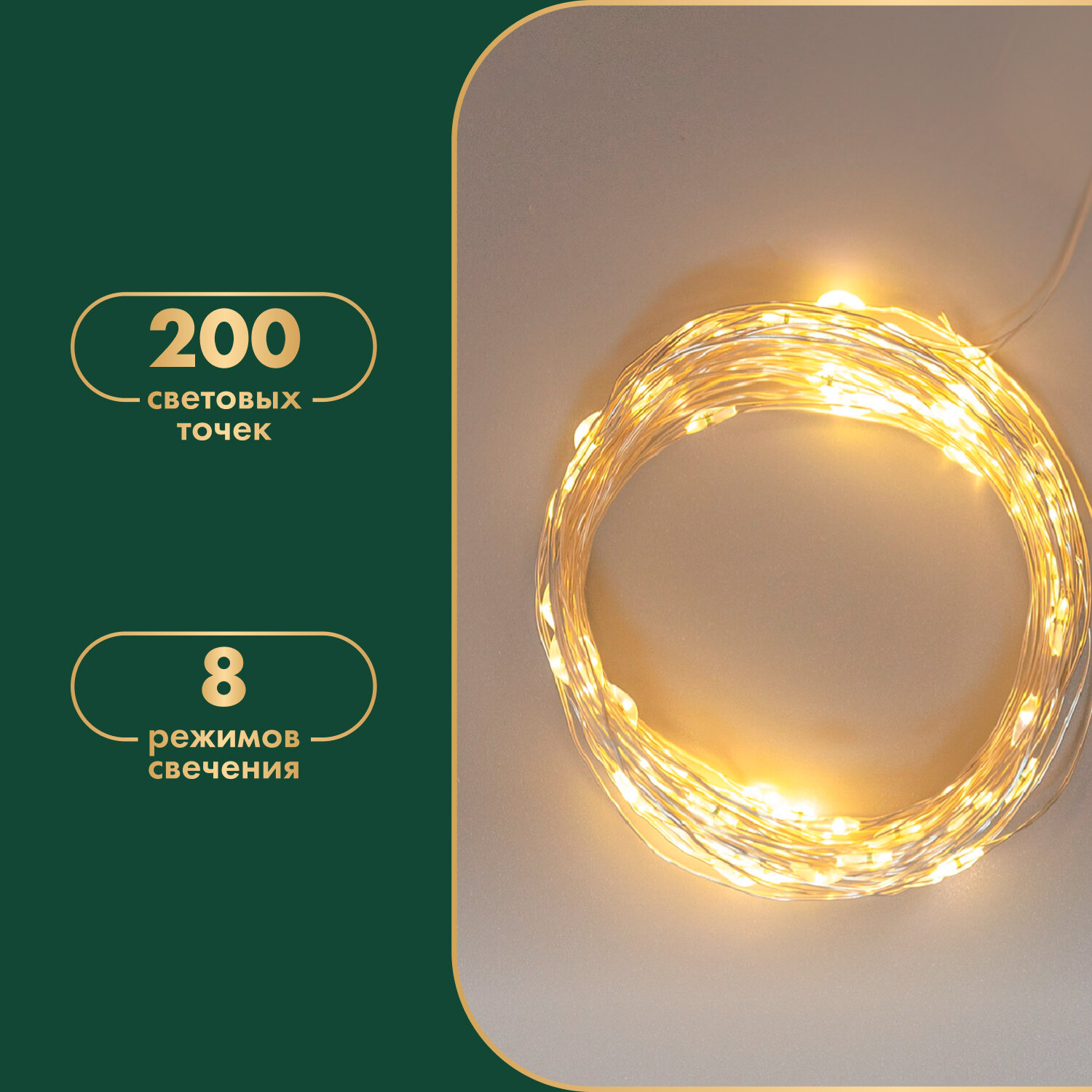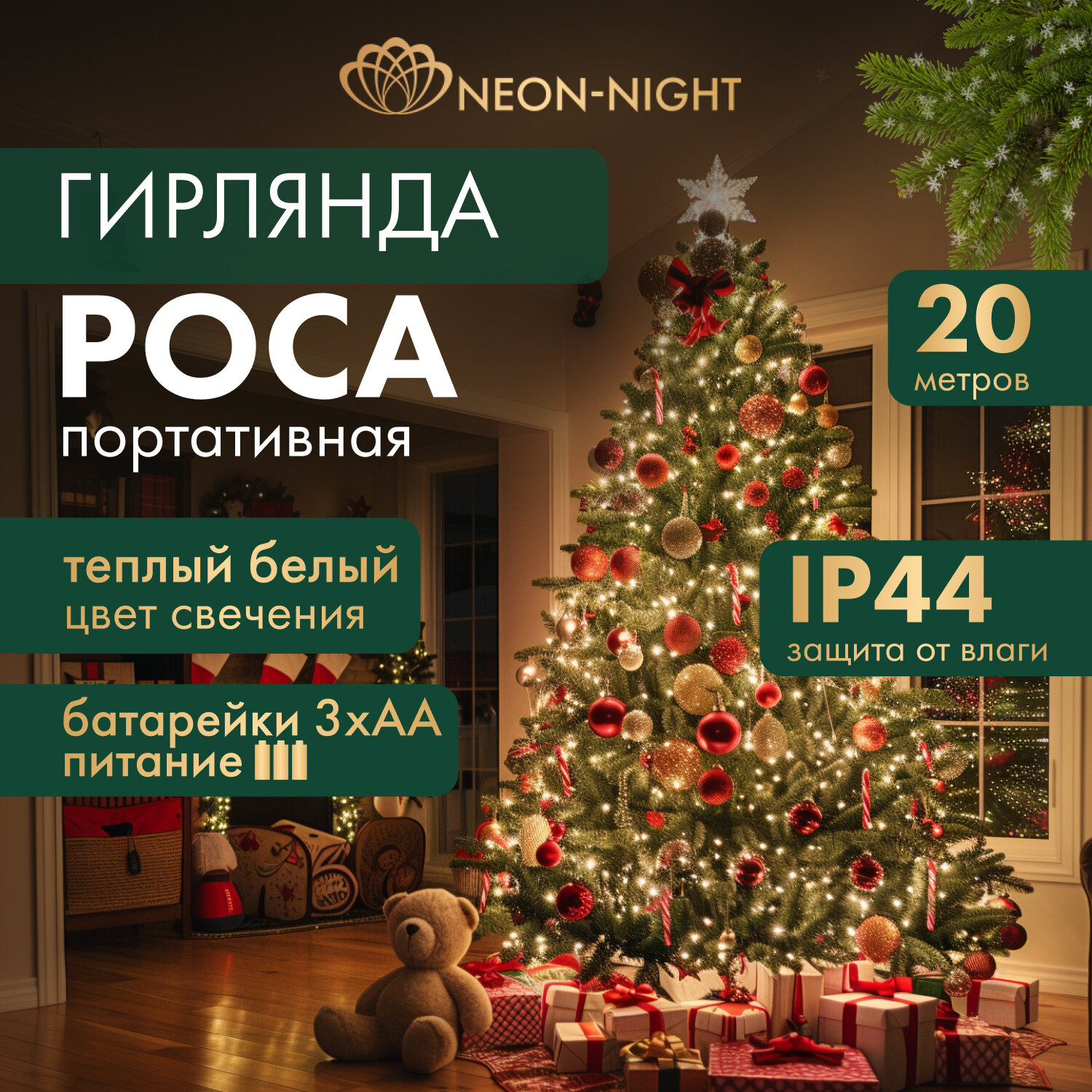 Гирлянда Роса 20м NEON-NIGHT, 200 LED, теплый белый, IP44, на батарейках 3хАА, с пультом 8 режимов интересное: