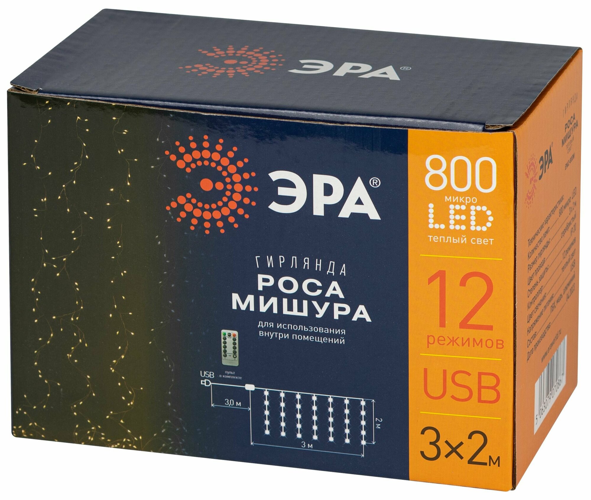 Купить Светодиодная новогодняя гирлянда ЭРА ENIZ-800W занавес Роса-мишура 3*2 м теплый свет 800 microled IP20