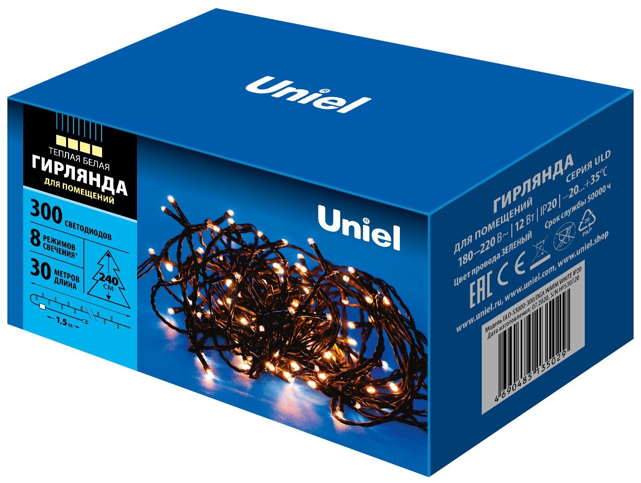 Гирлянда Uniel ULD-S5000-500/DGA UL-00009930, 50 х 0.025 х 0.03 м, 0.03 х 0.025 м, 500 ламп, теплый белый/зеленый провод
