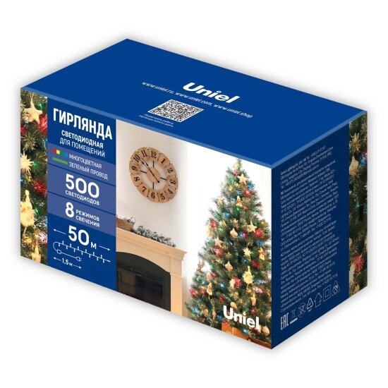 Гирлянда Uniel ULD-S5000-500/DGA UL-00009930, 50 х 0.025 х 0.03 м, 0.03 х 0.025 м, 500 ламп, теплый белый/зеленый провод