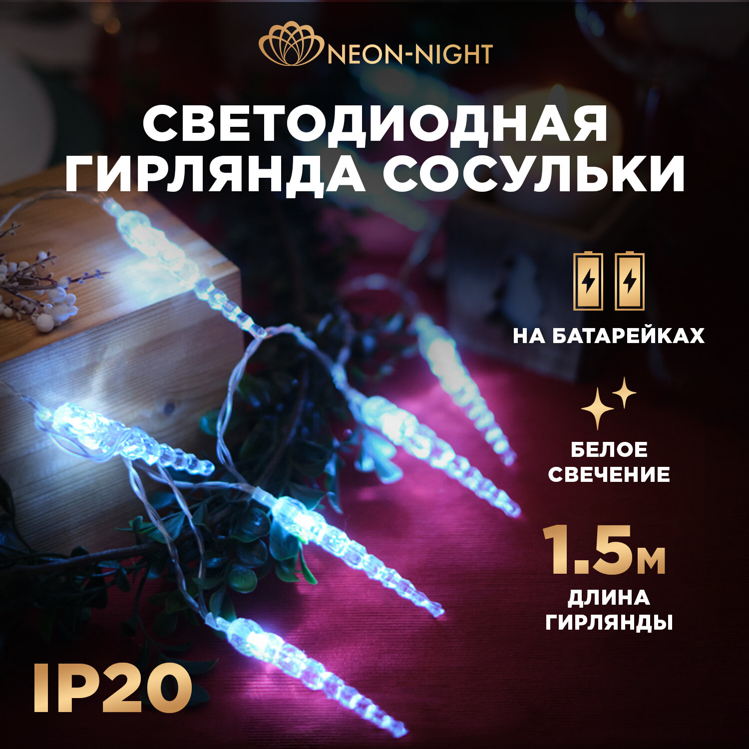 Купить Светодиодная гирлянда "Сосульки" Neon-Night на батарейках 1.5 м, белое свечение