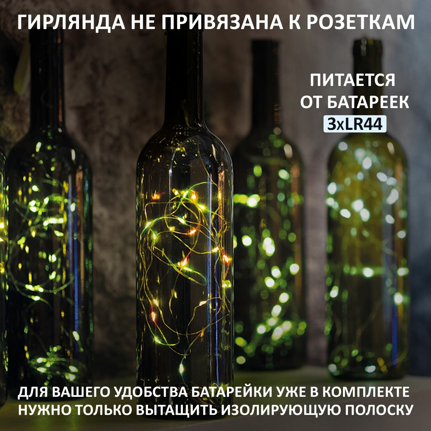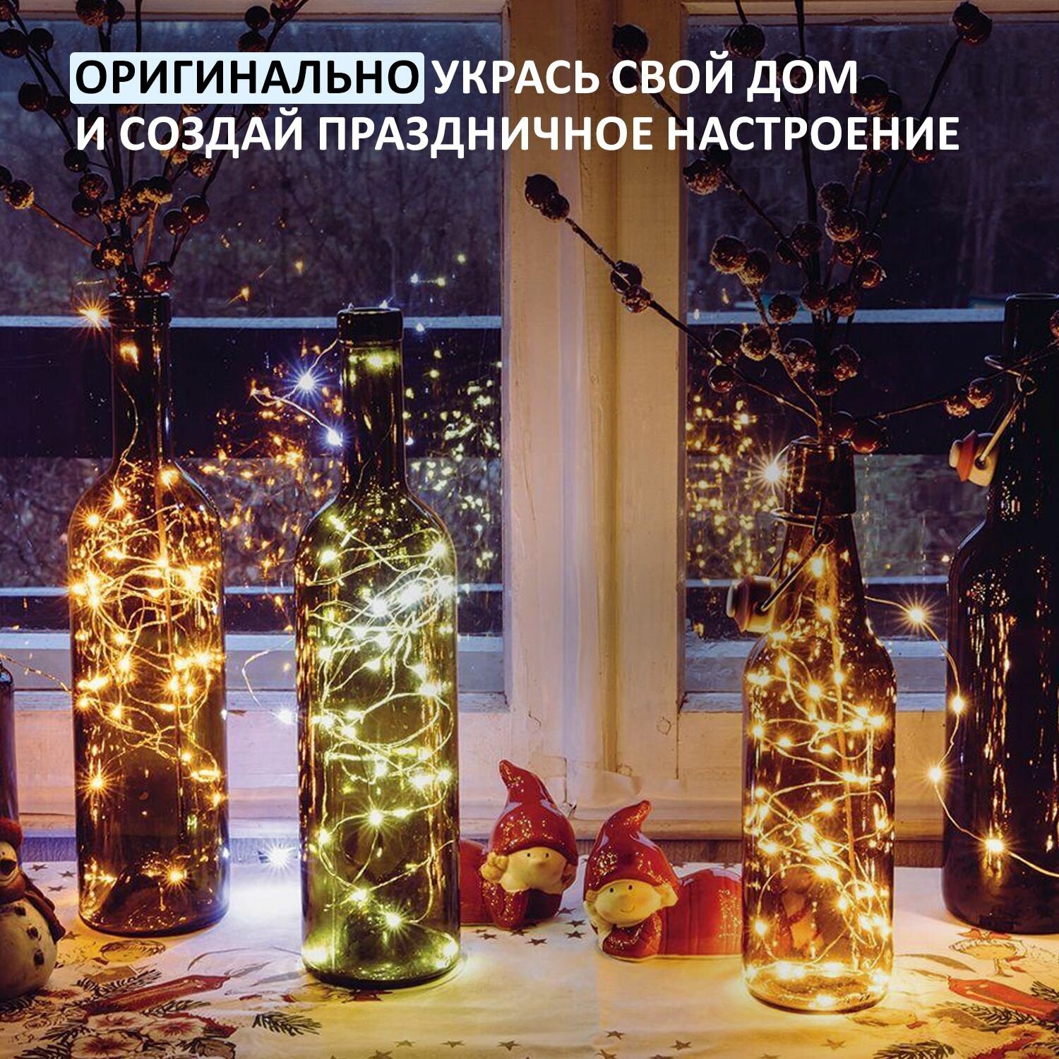 Светодиодная гирлянда новогодняя Роса Neon-Night с пробкой 2м для декорирования бутылок белое свечение интересное: