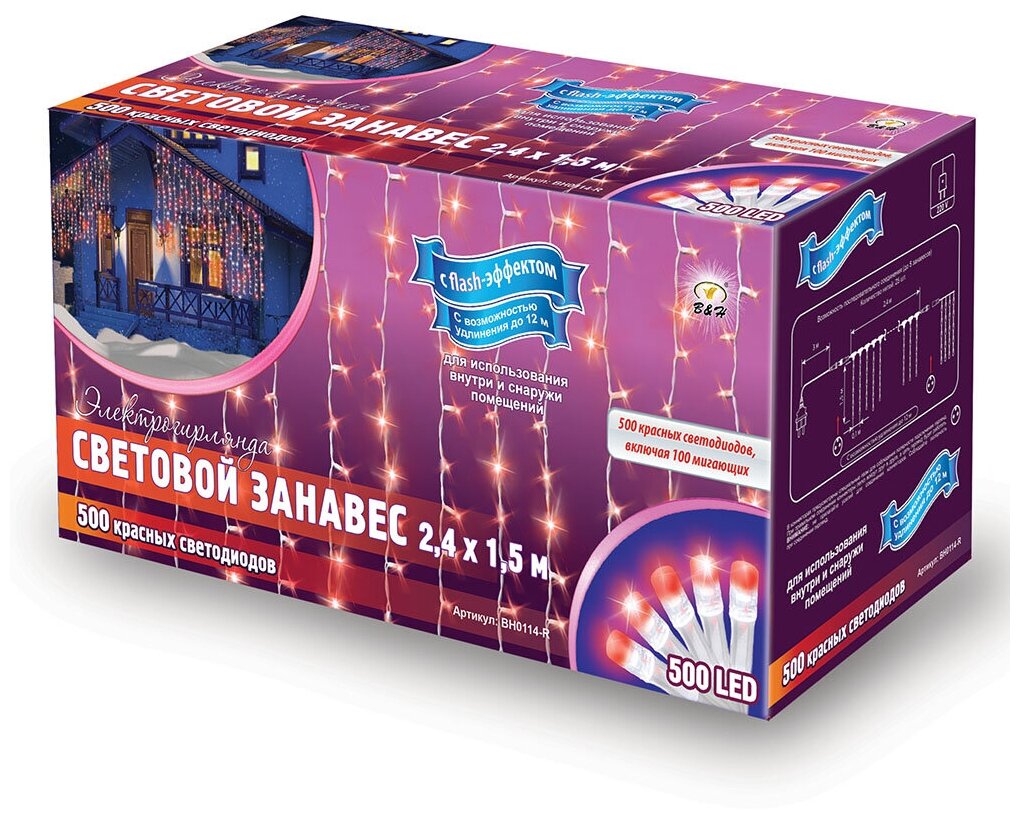 Электрогирлянда B&H Световой занавес BH0114-R, 2.4 х 1.5 м, 500 ламп, красный/прозрачный провод интересное: