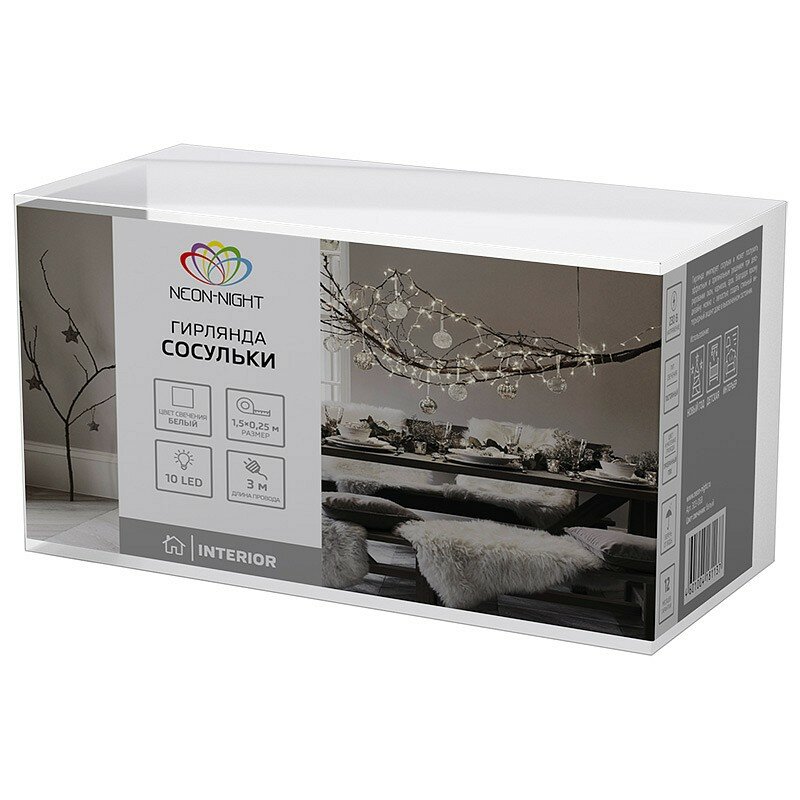 Купить Гирлянда светодиодная «Айсикл» (бахрома) «Сосульки» 1.5х0.25м 10LED бел. 0.51Вт IP20 провод прозр. Neon-Night 303-068