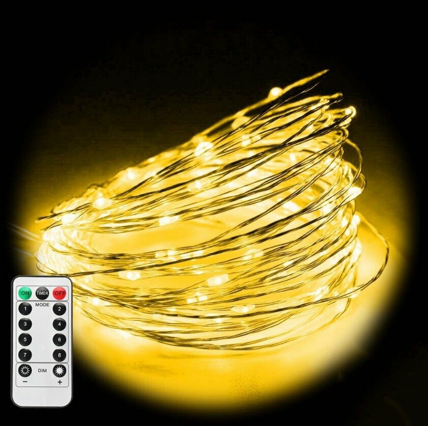 Гирлянда Роса 100 метров, с пультом управления, светодиодная, питание от сети, серебристый провод, желтый свет интересное: