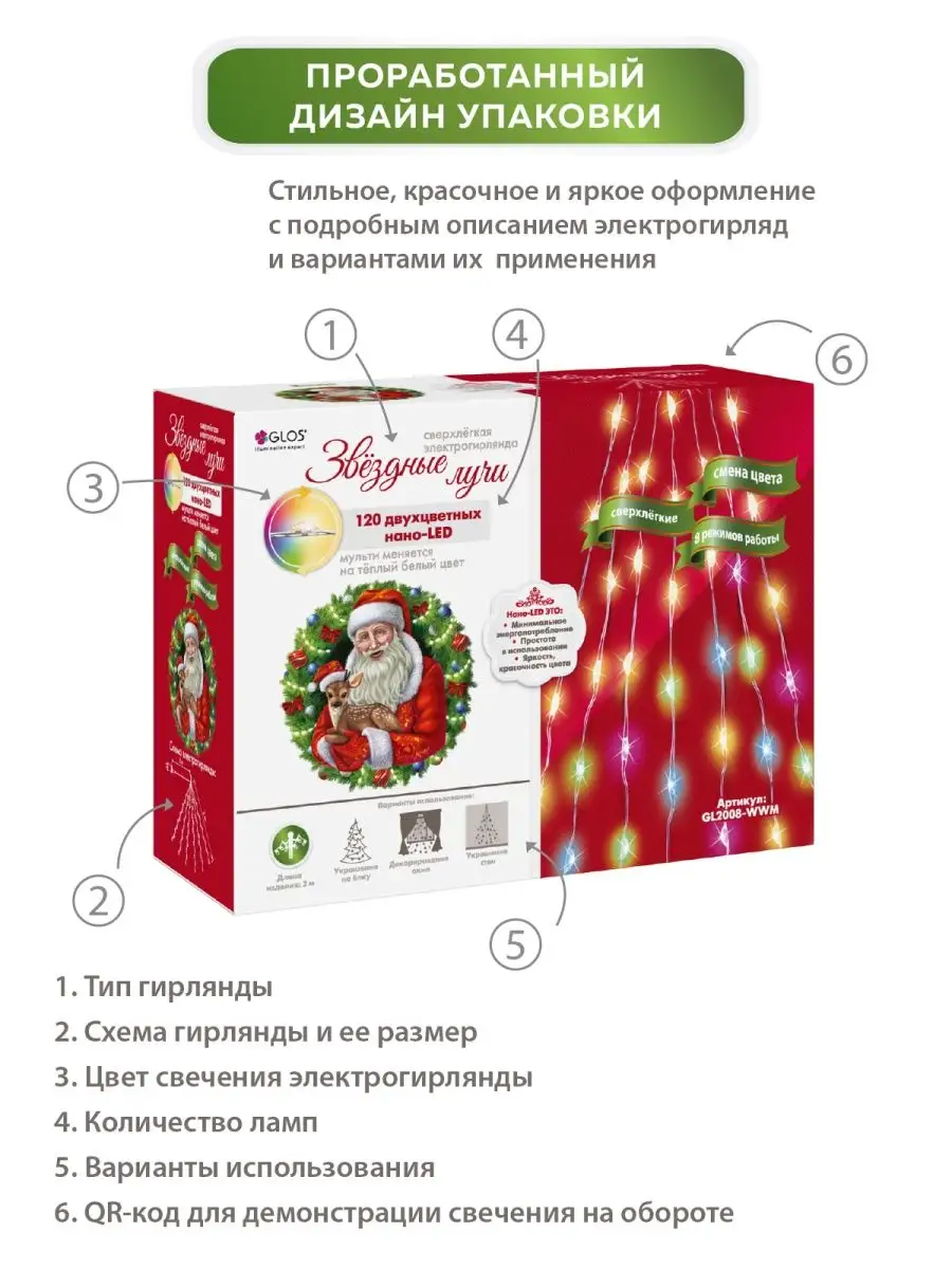 Электрогирлянда GLOS хвост Звездные лучи GL2008-WWM, 2 м, 120 ламп, мульти/теплый белый/прозрачный провод интересное: