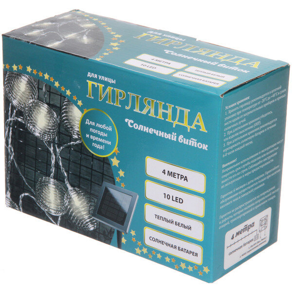 Купить Гирлянда для улицы «Солнечный виток» 4 м 10 ламп LED (4*5 см) чёрн. пров, 2 реж, IP-54, Теплый белый (солнечная батарея)