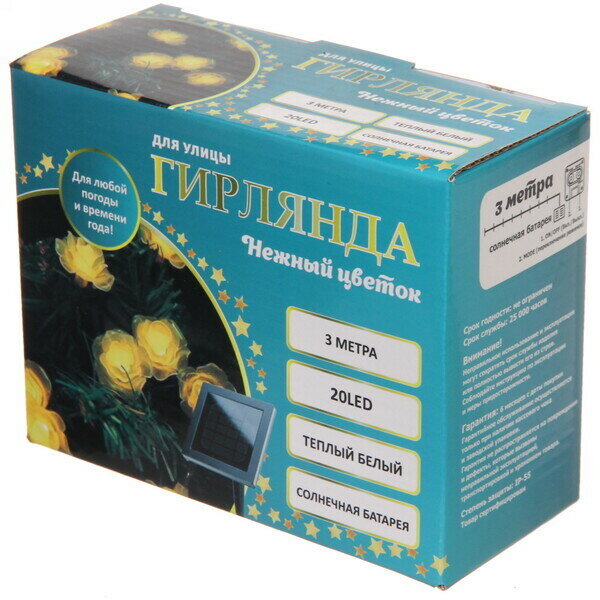 Купить Гирлянда для улицы «Нежный цветок» 3 м 20 ламп LED чёрный провод, 2 реж, IP-55, Теплый белый (солнечная батарея)