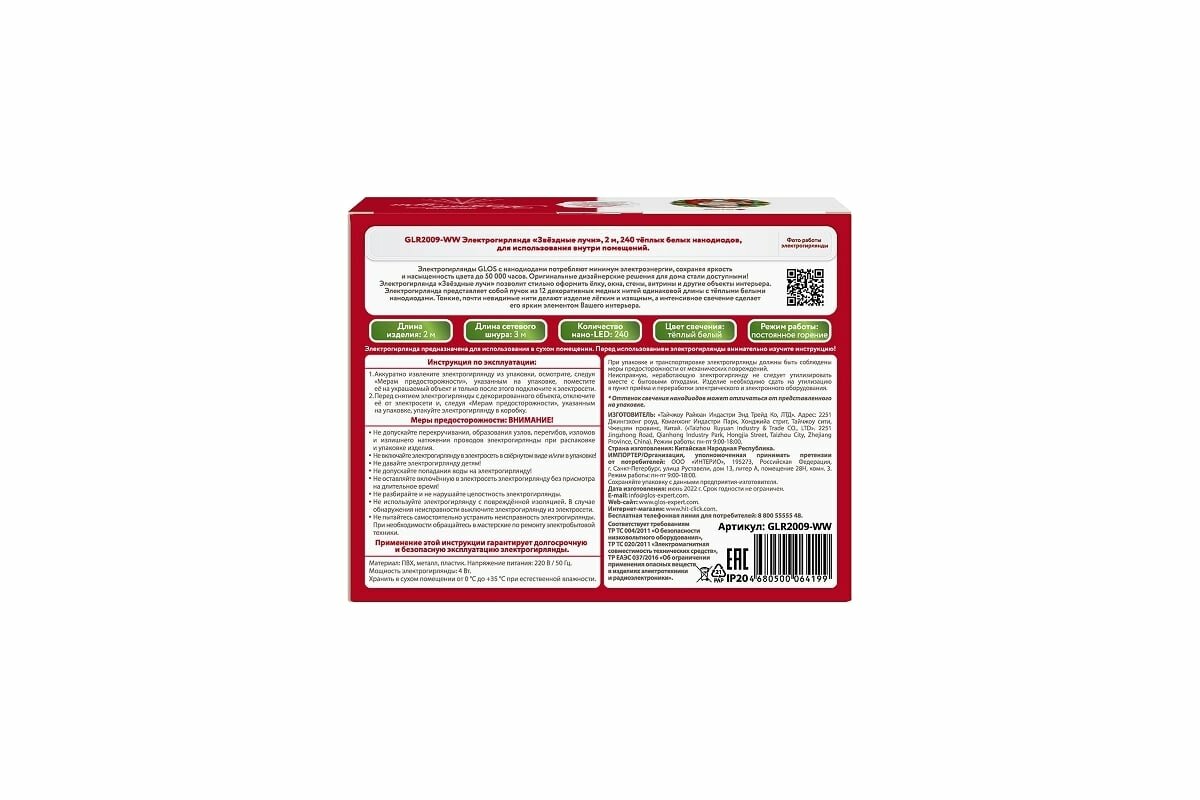 Электрогирлянда GLOS GLR2009-WW, 2 м, 240 ламп, теплый белый/прозрачный провод