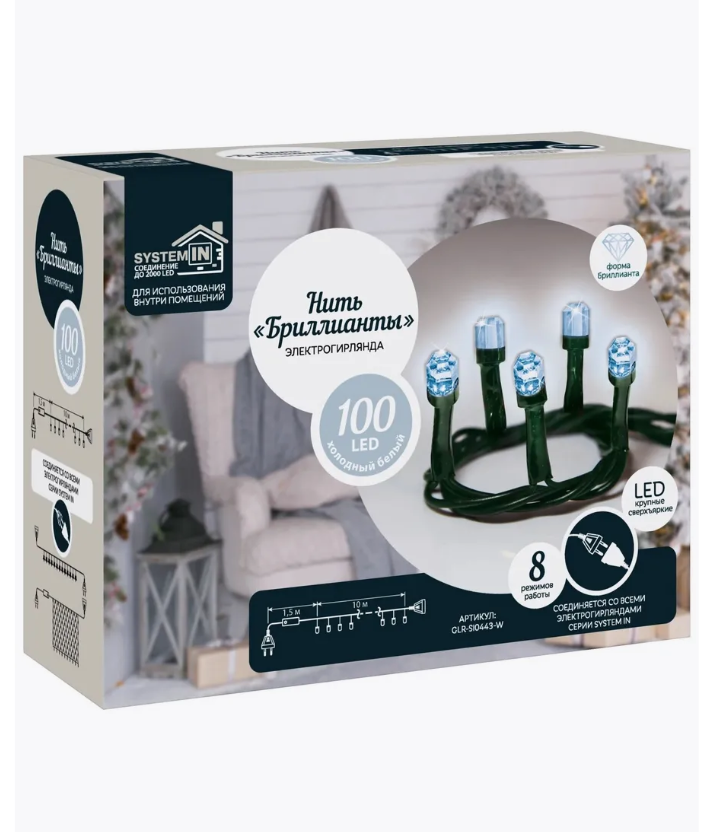 Электрогирлянда GLOS нить "Бриллианты», 10 метров, 100 сверхъярких холодных белых светодиодов GLR-SI0443-W интересное: