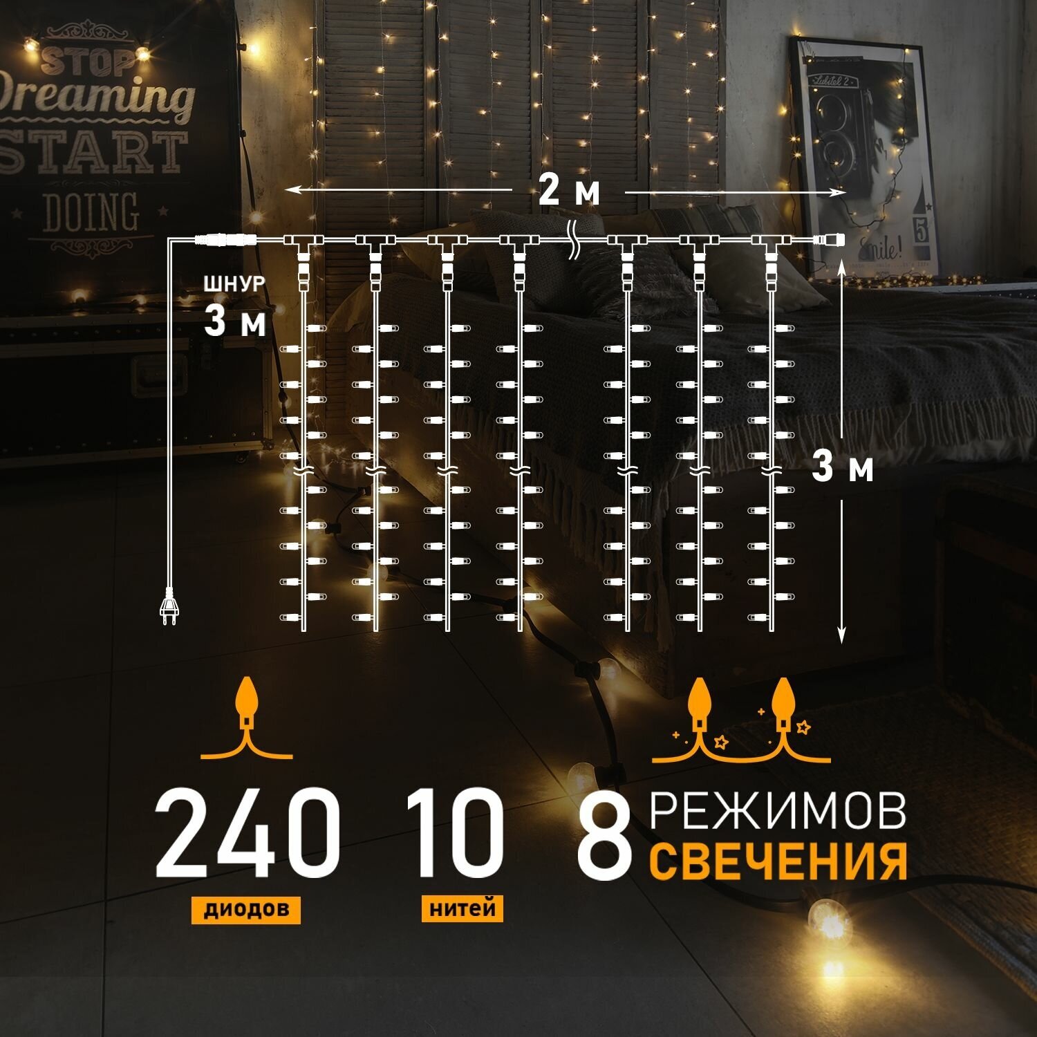 Гирлянда электрогирлянда новогодняя светодиодная 240 LED Neon-Night Дождь-занавес 2х3м с контроллером, теплое белое свечение интересное: