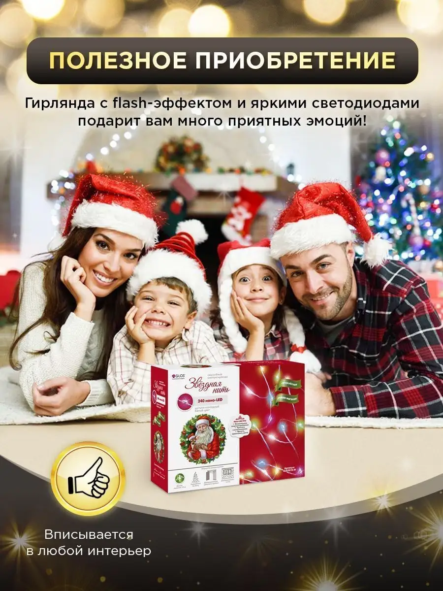 Электрогирлянда GLOS Звездная нить GLR2010-M, 12 м, 240 ламп, холодный белый/мульти/белый провод интересное: