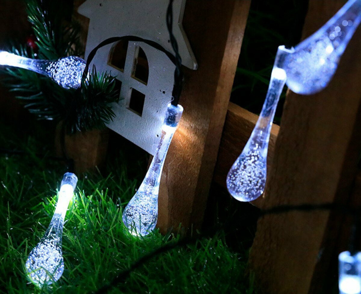 Светодиодная гирлянда в форме капель (7,3 см.) белые на солнечной батареи 30 ламп 6 метров