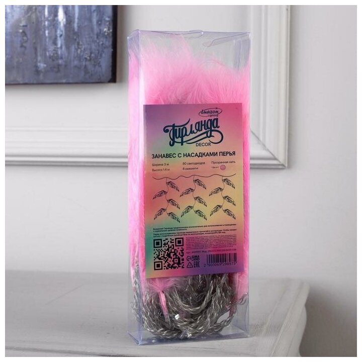 Гирлянда «Занавес» 3 × 1.4 м с насадками «Перья», IP20, прозрачная нить, 80 LED, свечение розовое, 8 режимов, 220 В
