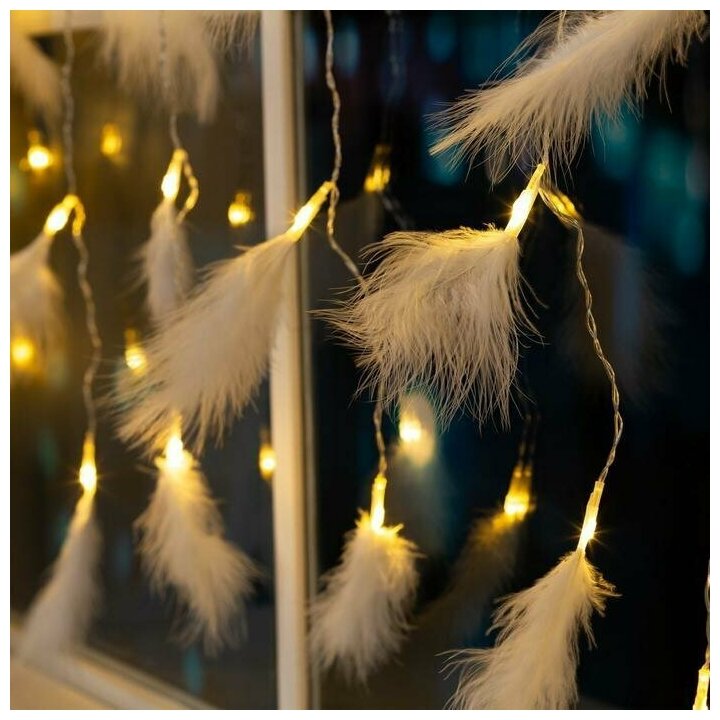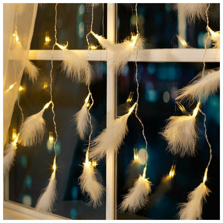 Гирлянда «Занавес» 3 × 1.4 м с насадками «Перья», IP20, прозрачная нить, 80 LED, свечение тёплое белое, 8 режимов, 220 В