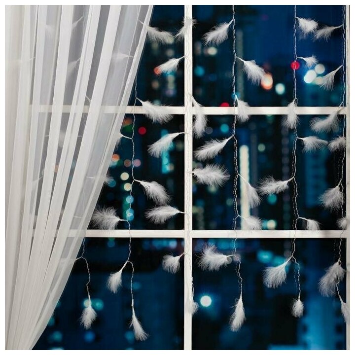 Гирлянда «Занавес» 3 × 1.4 м с насадками «Перья», IP20, прозрачная нить, 80 LED, свечение белое, 8 режимов, 220 В