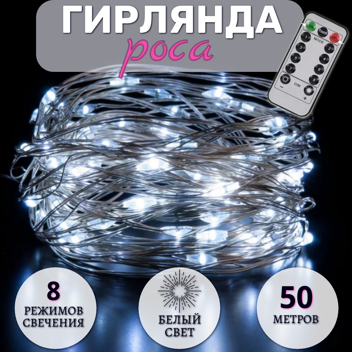 Гирлянда Роса 50 метров, светодиодная, питание от сети, серебристый провод, белый свет интересное: