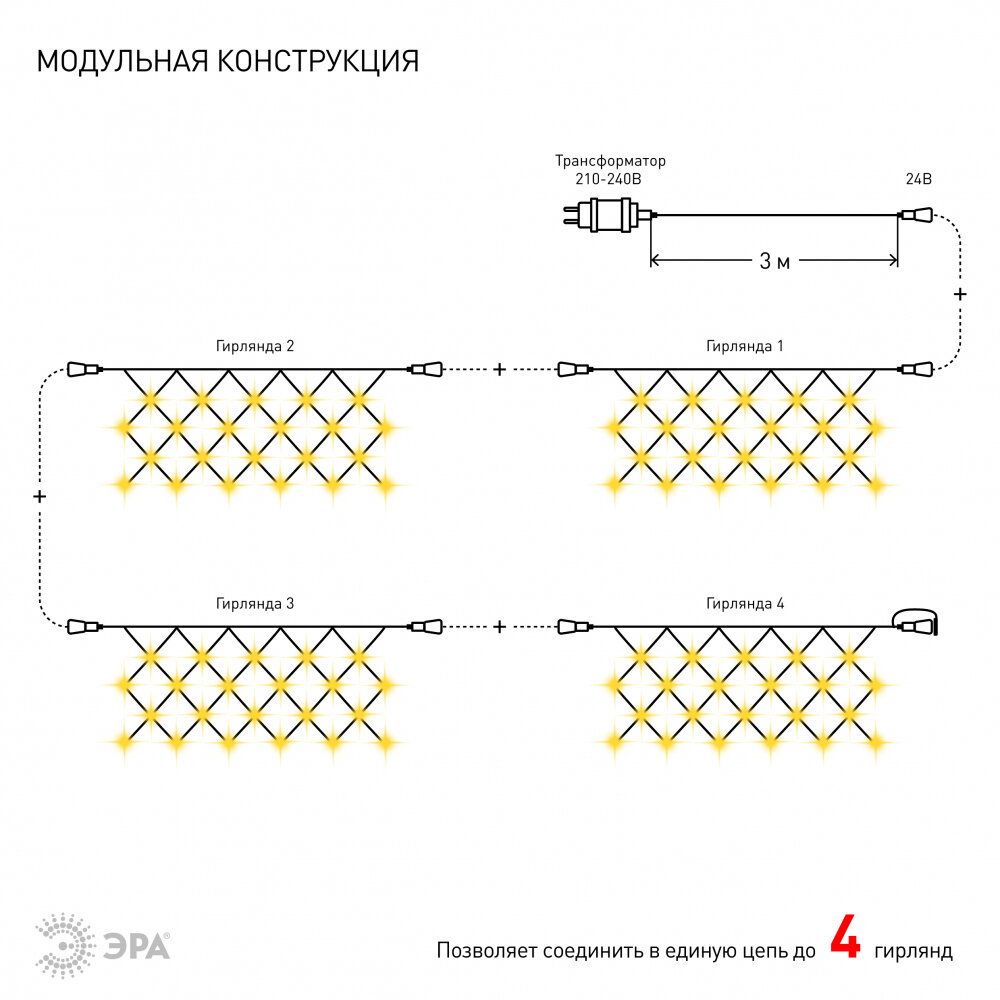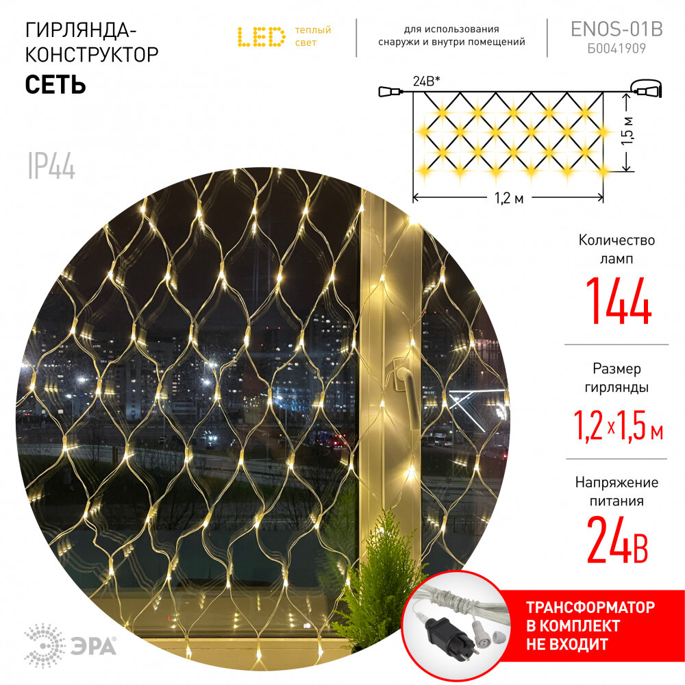 Гирлянда новогодняя светодиодная сеть ENOS-01B ЭРА для улицы и дома, теплый свет 1,5х1,2 м, 144 LED интересное: