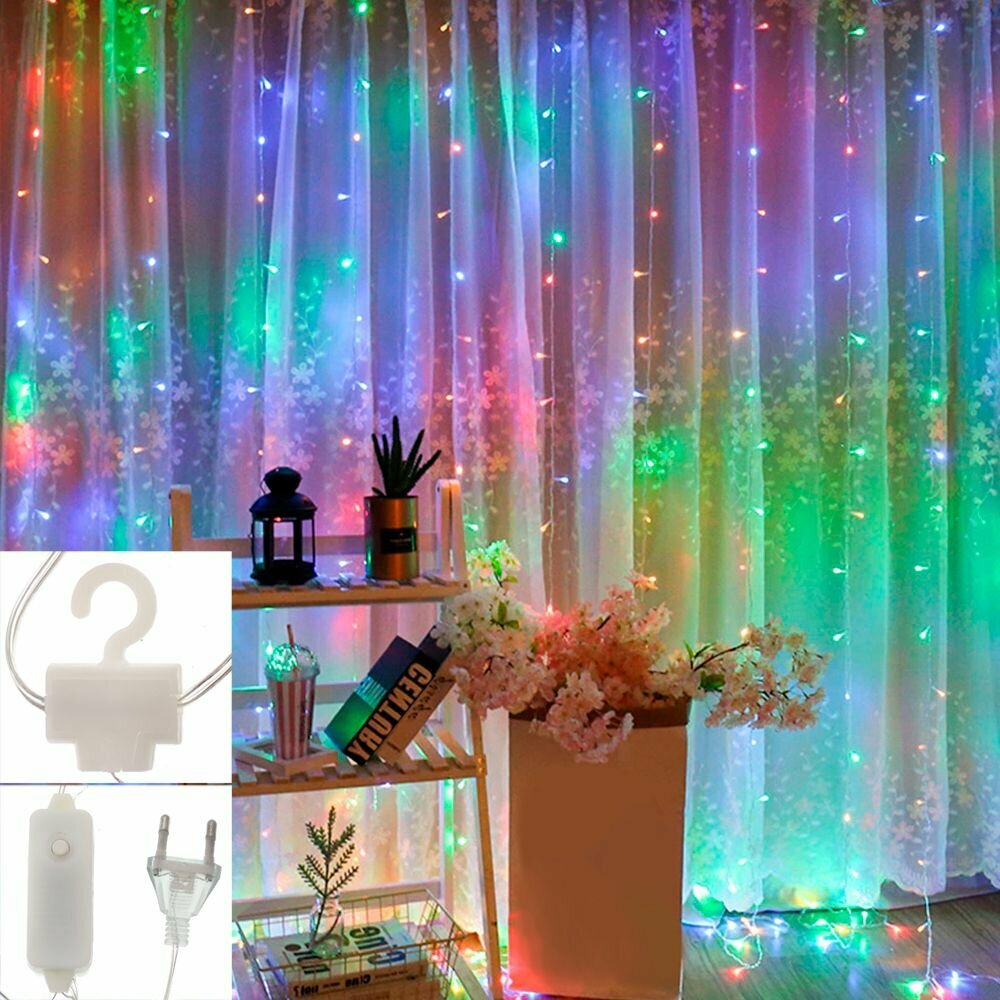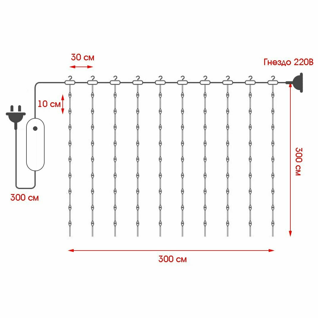 Купить Гирлянда-штора с крючком LED Мультицвет (3х3м,300 ламп,220В)Огонек OG-LDG23