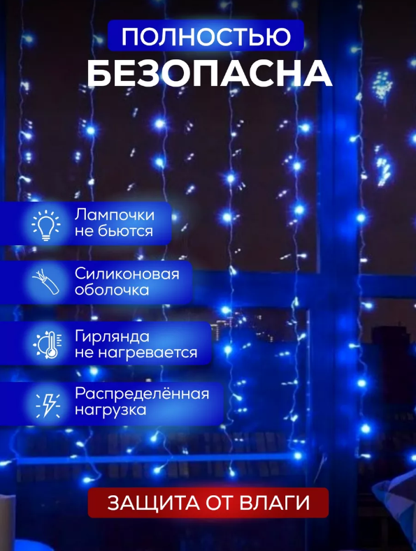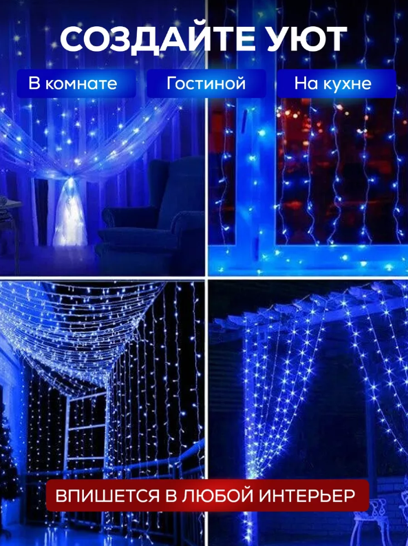 Светодиодная гирлянда штора, 1,5м на 1,5м, синий интересное: