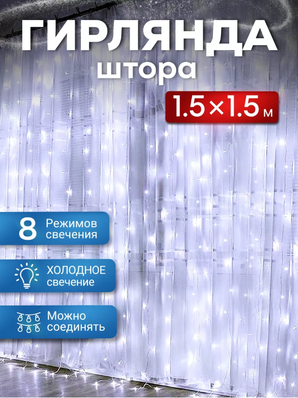 Светодиодная гирлянда штора, 1,5м на 1,5м, холодный белый интересное: