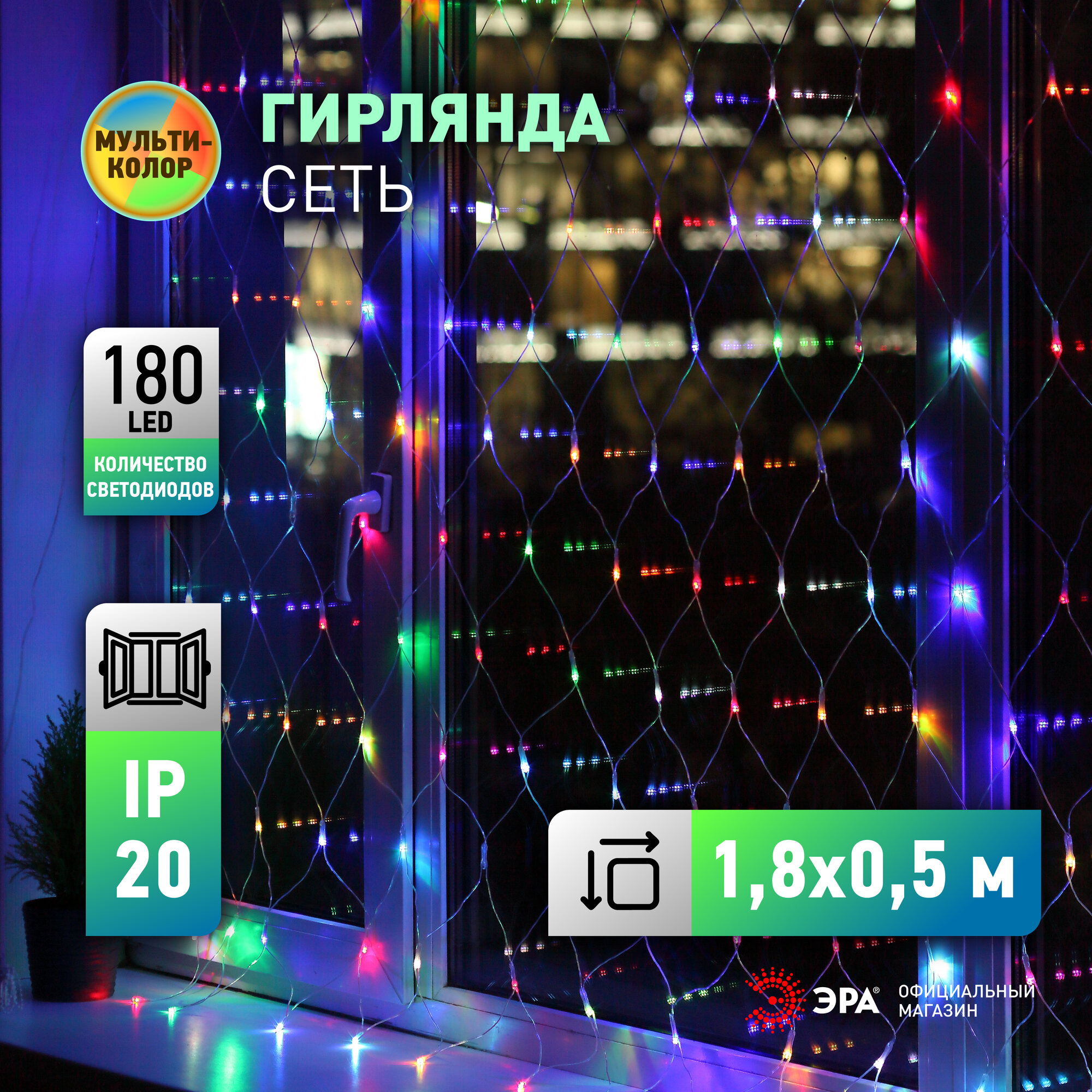 Гирлянда светодиодная сеть занавес ENIS-01R ЭРА оконная от сети 1,8 м*1,5 м, RGB, 180 LED интересное: