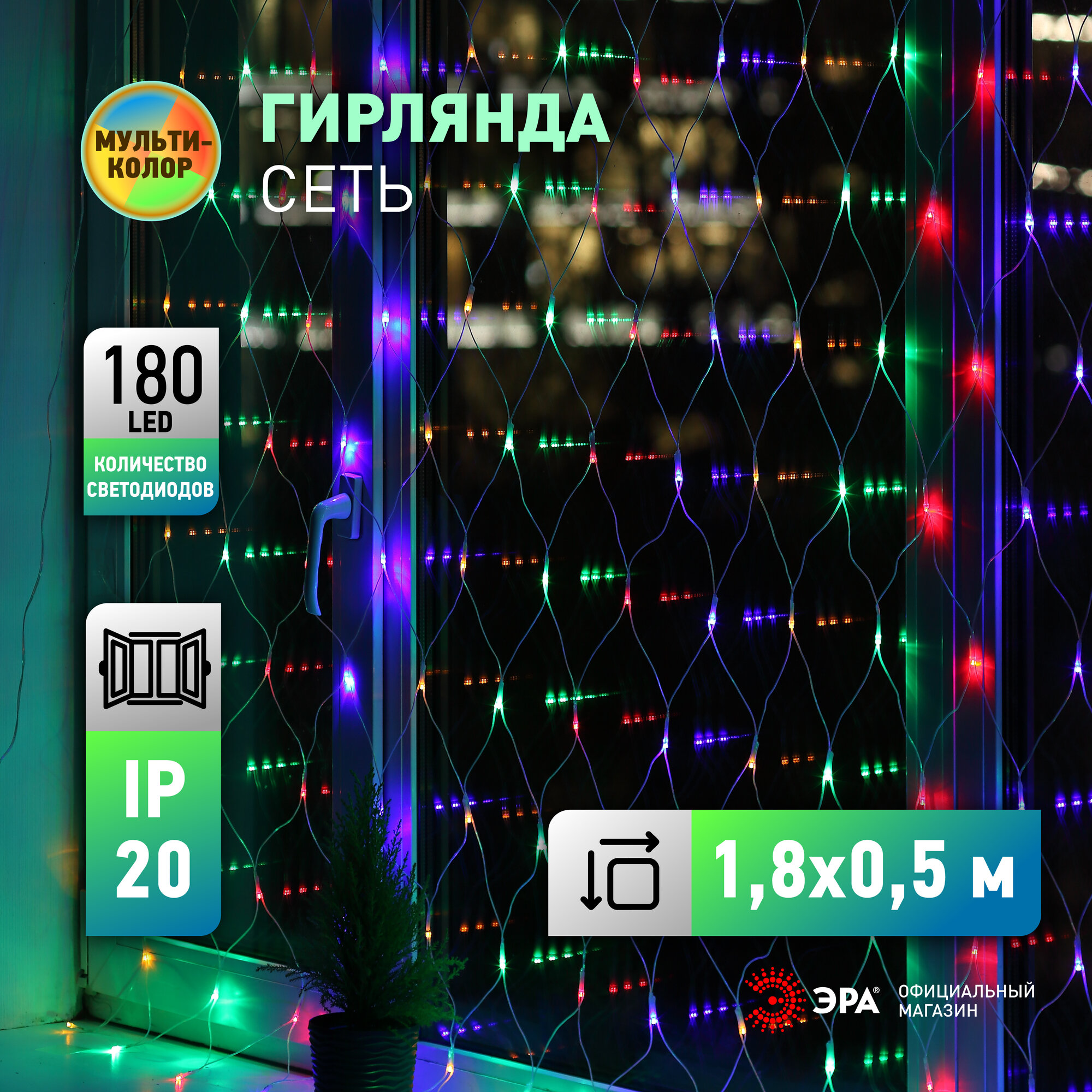 Гирлянда светодиодная сеть штора ENIS-01M ЭРА оконная от сети 1,8 х 1,5 м, мультиколор, RGB, 180 LED интересное:
