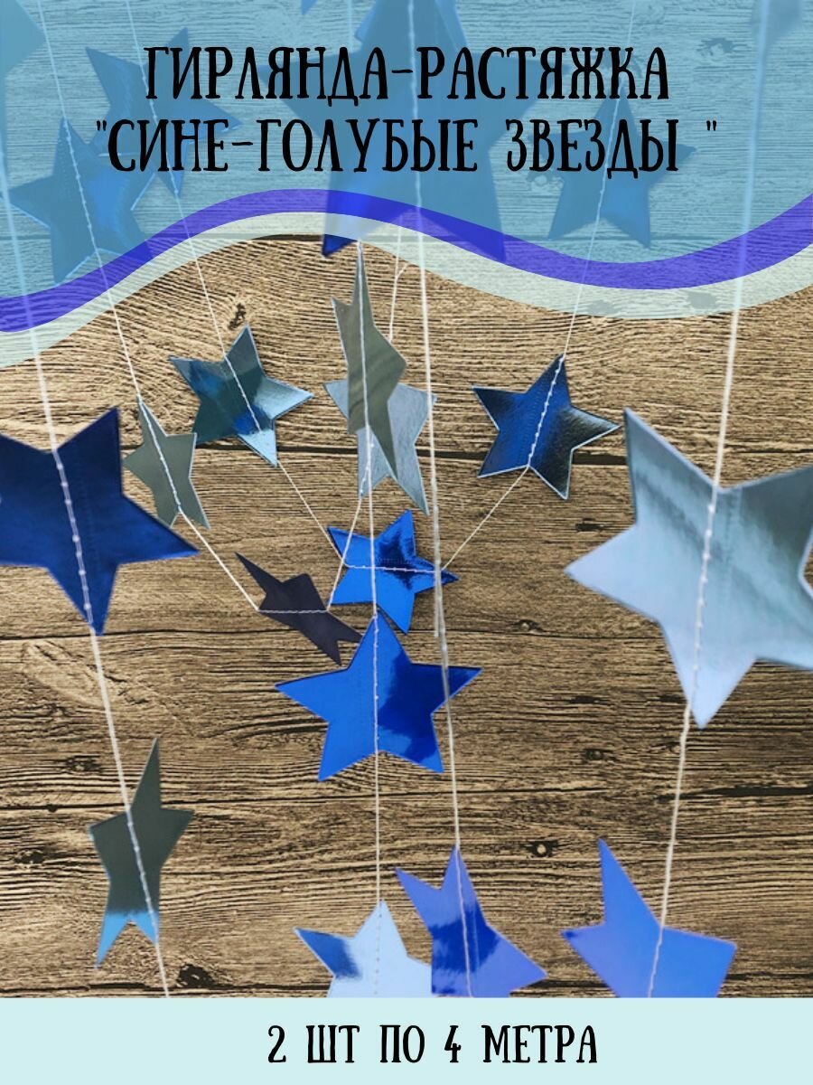 Гирлянда растяжка бумажная, Звёзды, голубые, Нить 4 метра, 2 шт.