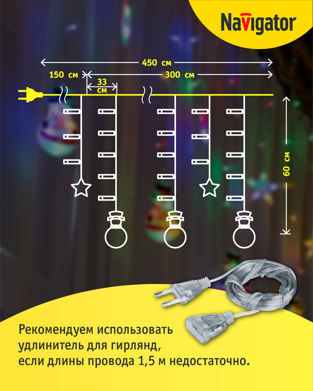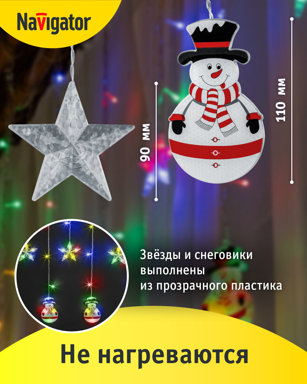 Гирлянда-бахрома «звёзды и снеговики» Navigator 95 026, 3x0.6 м, разноцветный свет интересное: