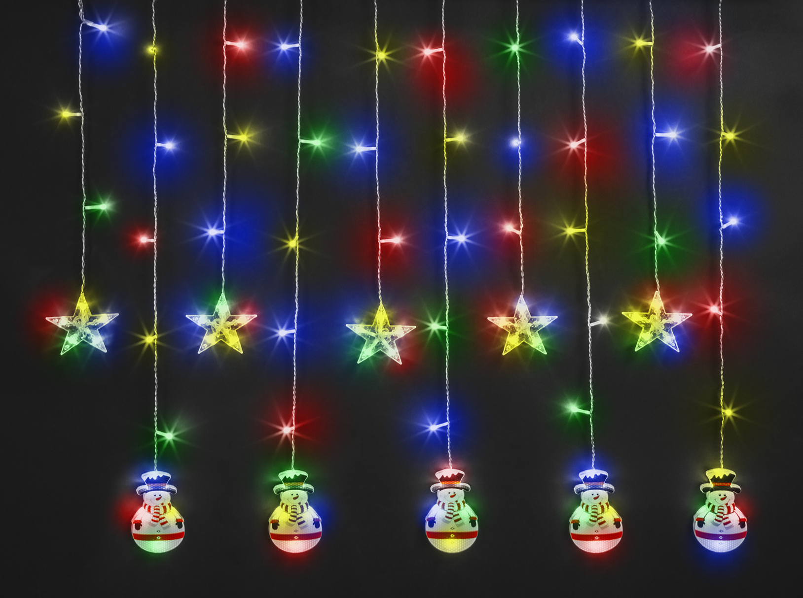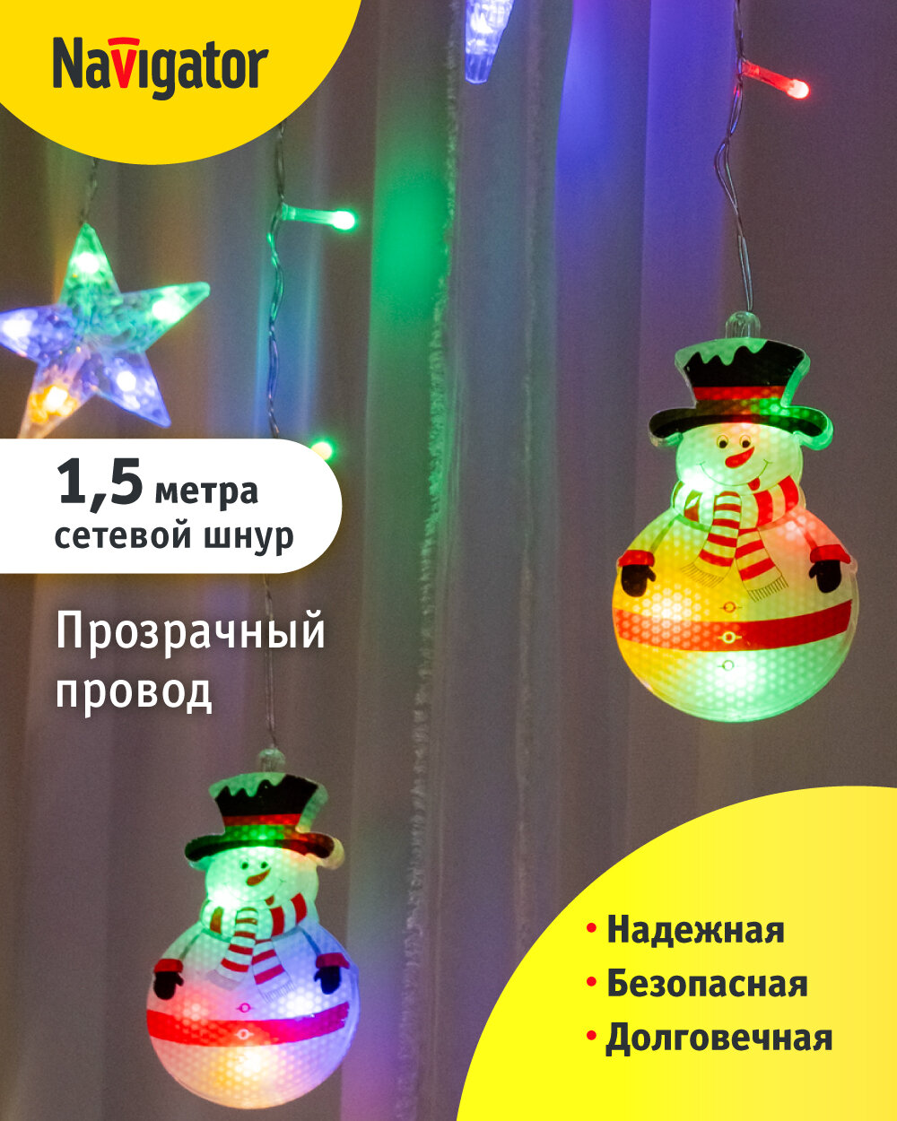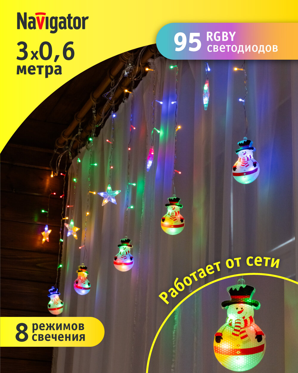 Купить Гирлянда-бахрома «звёзды и снеговики» Navigator 95 026, 3x0.6 м, разноцветный свет