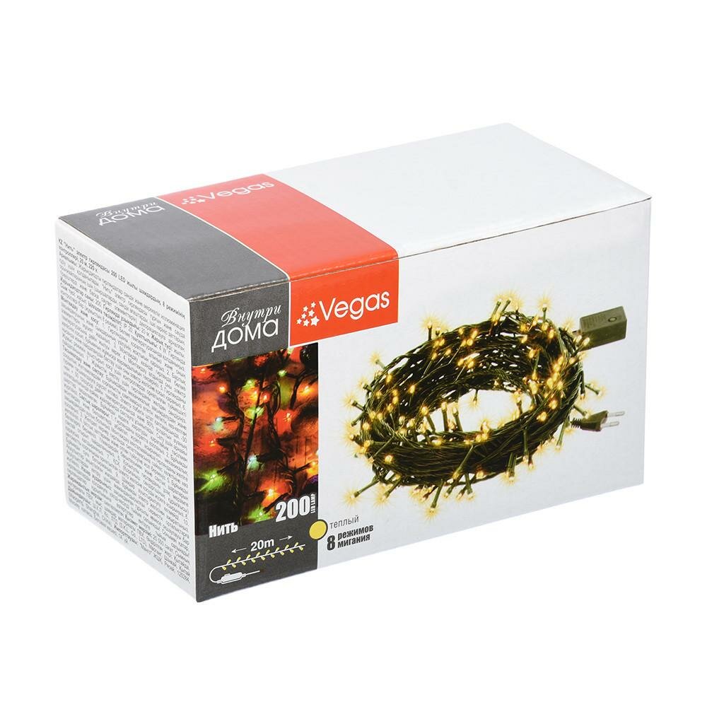 Купить VEGAS Электрогирлянда "Нить" 200 теплых LED ламп, контроллер 8 режимов, зеленый провод, 20 м, 220 v